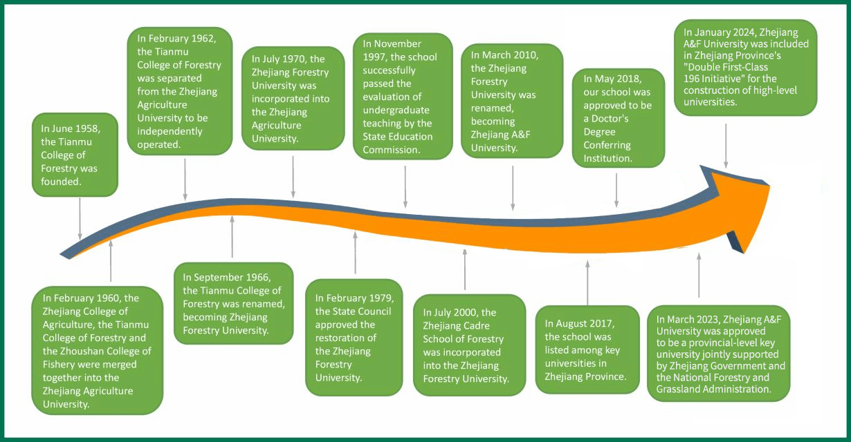 Established in 1958, Zhejiang A&F University (ZAFU) is a provincial-level key university jointly developed by Zhejiang Province with two ministerial  government bodies, namely the State Forestry and Grassland Administration and Ministry of Agriculture and Rural Affairs.