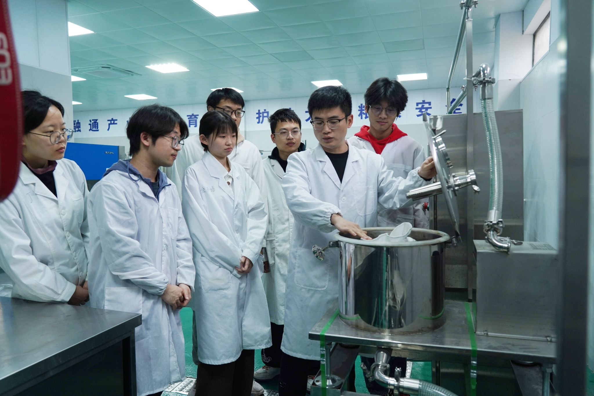 学生们在中试车间学习酿酒。