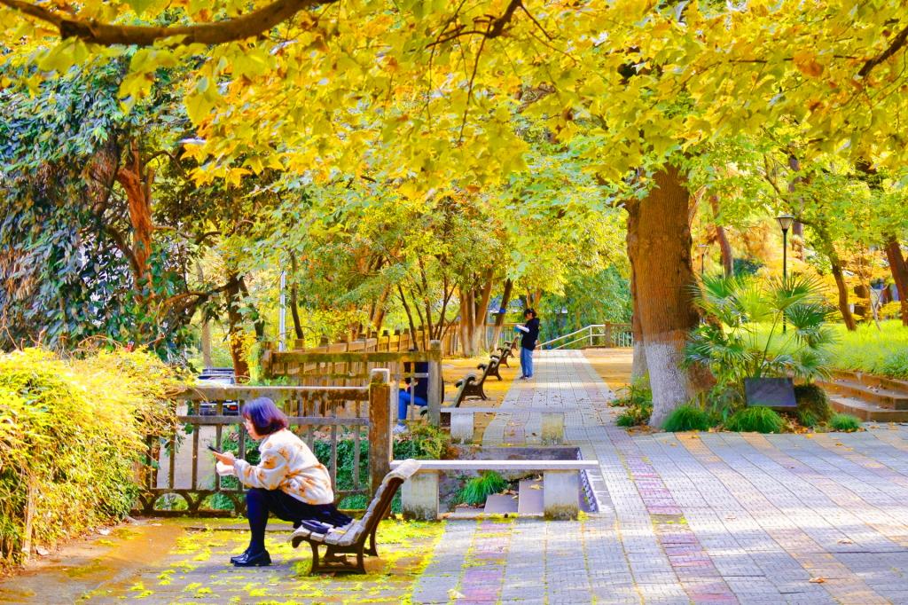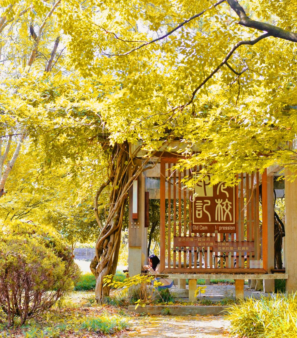 暖阳下,秋色一点点在林稍间抹开。沐浴着秋日阳光,坐在黄透的银杏树下,一幅幅醉美秋意画卷正在浙农林大校园徐徐展开,叶片和枝桠的缝隙间,是光与影的完美融合,是色与彩的交织碰撞。教学楼门外的枫树也擎起了火炬,层林尽染,漫山红遍,那火热的色彩点燃了生命,也点燃了秋天。松柏翠绿依旧,沉稳地微笑着,注视着这并不缺少色彩的秋。