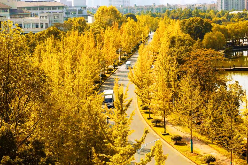 行走于东湖畔,金黄色的银杏与火红的池杉争相斗艳。漫步于衣锦园,古枫迎着秋风,在向每一位农林学子讲述着学校建设与发展的华丽篇章,奏响一曲秋天的主旋律。在美丽生态的秋日校园,听农林学子吟诵于晓光熹微,掩卷沉思,心有笃志。
