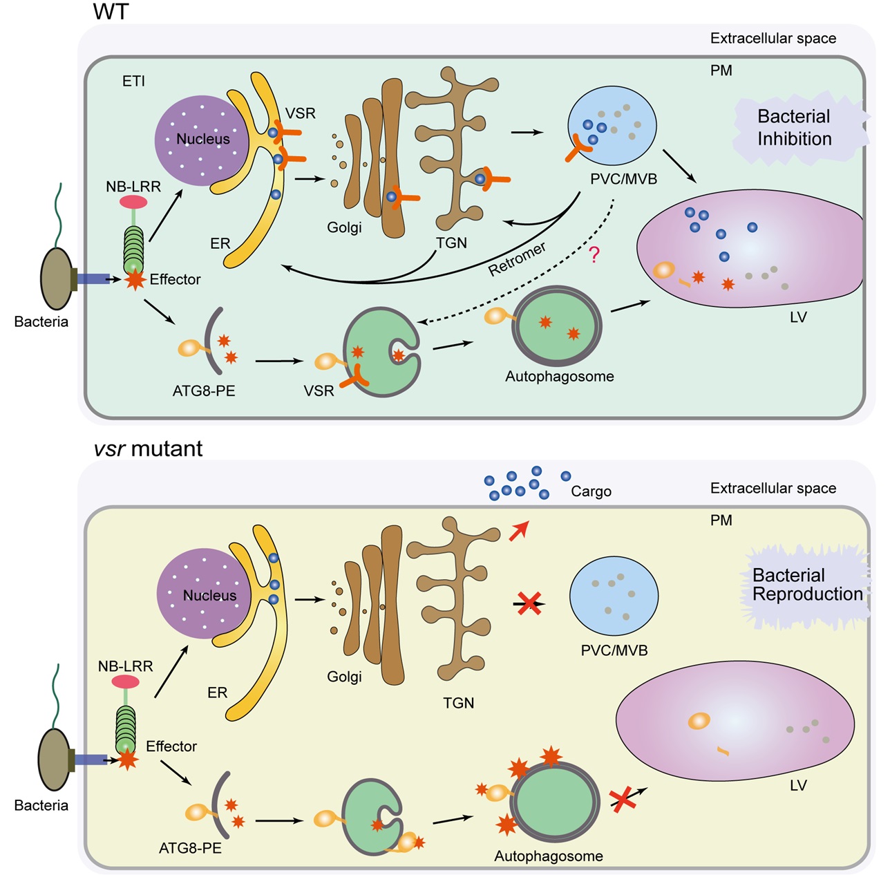 近日,开云电竞s13森林食物资源挖掘与利用全国重点实验室沈锦波教授团队在《自然-植物》在线发表题为《植物液泡分选受体协同调控液泡与自噬途径参与效应因子触发免疫》的研究论文。该研究揭示了植物液泡分选受体VSRs通过调控液泡水解酶精准投递与效应因子自噬清除的“双线作战”,有效抵抗病原细菌的侵染,为农林作物抗病育种提供了新的分子靶点。