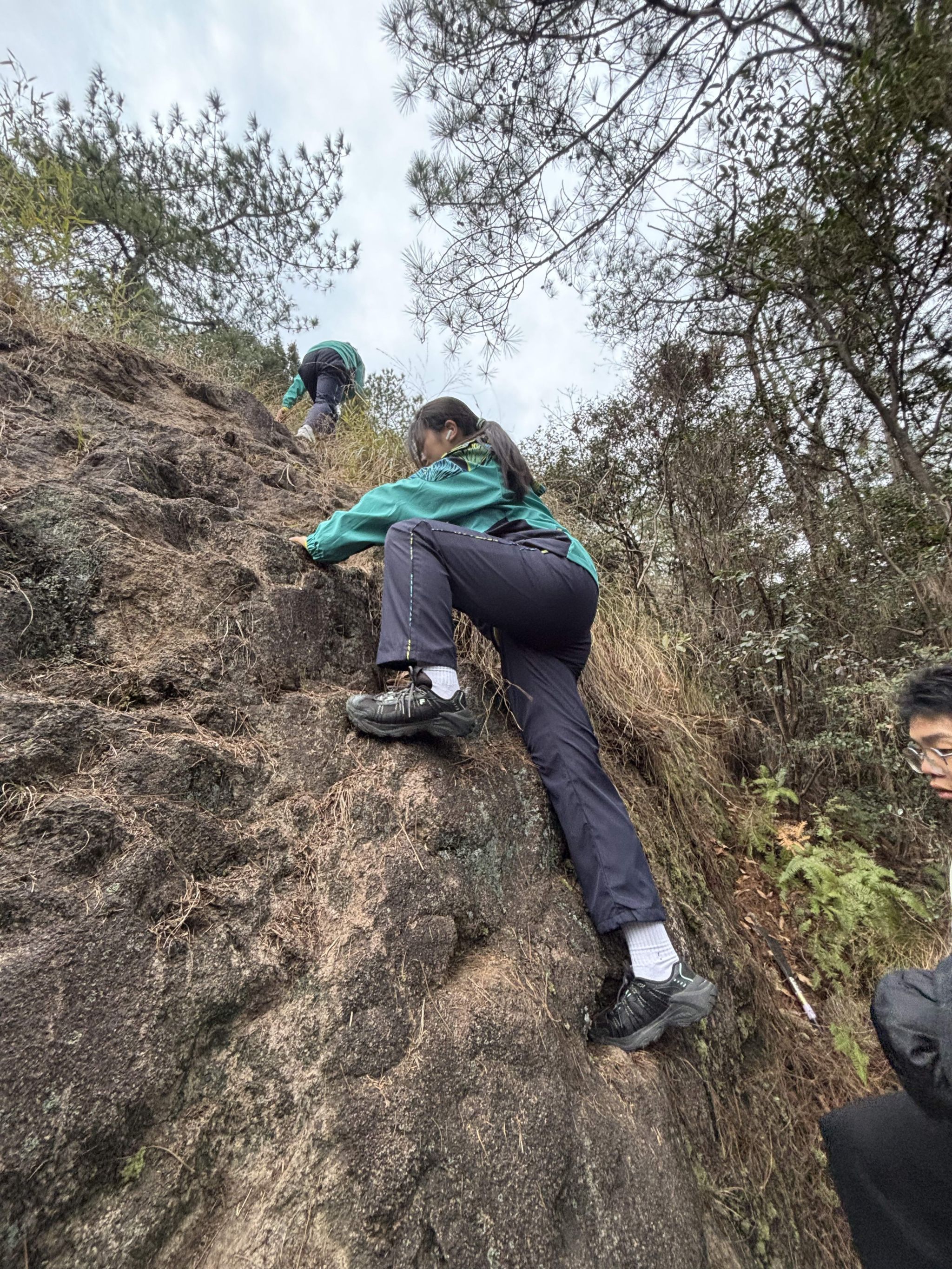 行进途中,老师和领队同学分工明确,驻守队伍前、中、后关键位置,把控行进节奏。面对陡坡与荆棘,同学们相互鼓励、彼此照应,将课堂上学到的户外安全知识灵活运用。