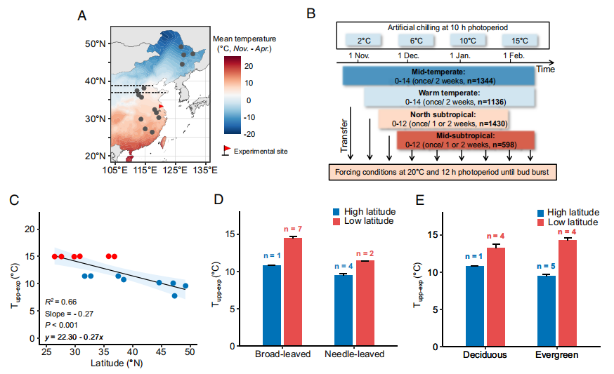 大规模控温试验揭示树木休眠解除有效低温阈值Tupp随纬度变异规律.(课题组供图)