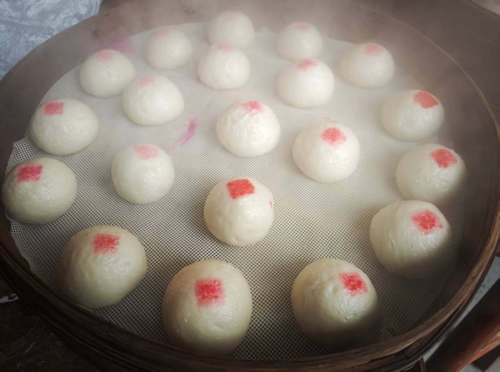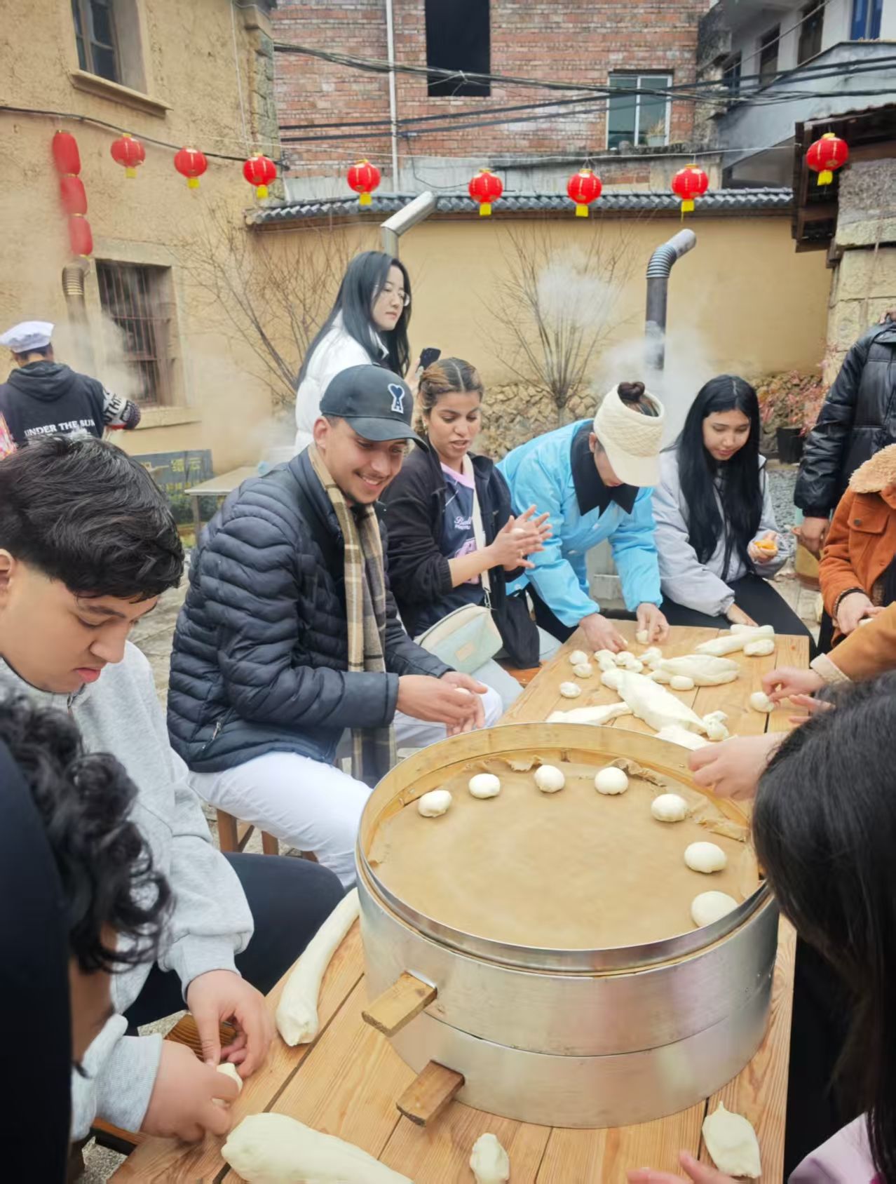 随着县政协副主席钭旭彬宣布馒头开笼,蒸腾的热气裹挟着香甜扑面而来,领导们为刚出炉的馒头点红,一抹抹喜庆的朱红为这份传统年味添上点睛之笔。在稠门村红色食堂,留学生们围在案板前,在当地老师的指导下亲手体验和面、揉团、造型,笨拙却认真的动作引来阵阵欢笑。从掌握面团发酵的微妙平衡,到感受手工揉制的力度技巧,留学生们在一捏一揉间,触摸到中国传统饮食文化的精髓。有留学生兴奋地展示自己制作的馒头,坦言这是“最特别的新年礼物”,让远在异国他乡的自己感受到了家的温暖。
