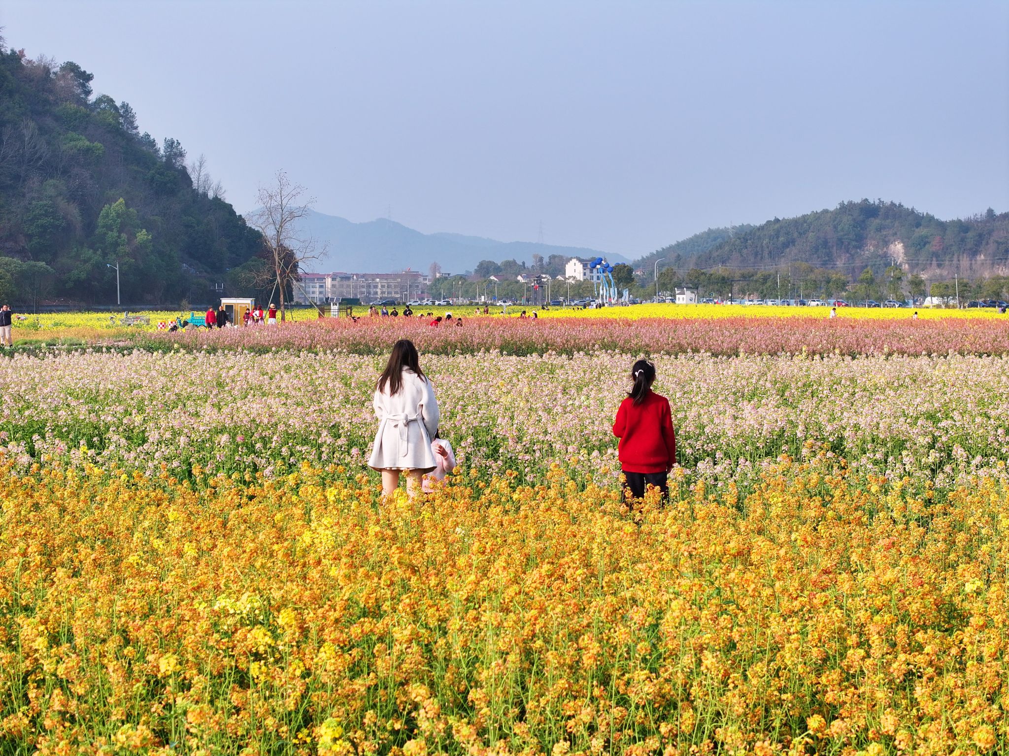 3月末,正是春暖花开的日子,在金华市武义县大田乡白衣坑村茶塘畈,500余亩油菜花田进入盛花期,与往年不同的是,今年这片花海不再只是单一的黄色,淡粉、橘黄、乳白等七彩花色与传统金黄交织错落,成为春日里亮眼的独特风景。
