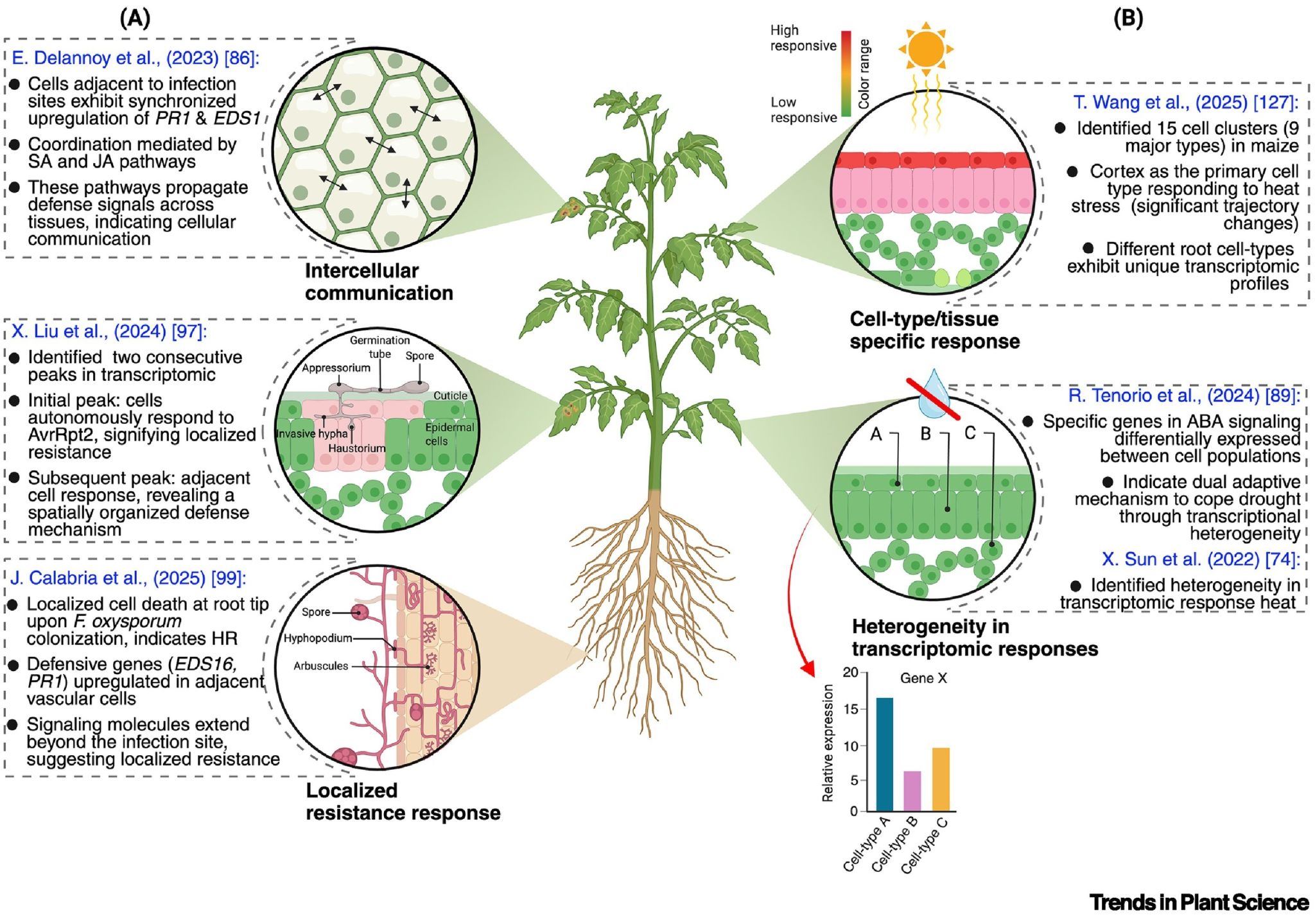 研究表明,植物应对胁迫时的细胞间相互作用并非独立通路的简单叠加,而是重塑信号层级、改变细胞状态轨迹,并在组织中重新分布空间响应模式。植物免疫以“防御微域”(defensive microdomains)形式精准启动,而非在组织中均匀部署。这些免疫响应在空间上被限制在病原体邻近区域,通过协调的细胞间信号在相邻细胞中触发分层激活,包括Ca2?、ROS和SA依赖的信号。与局部化的生物胁迫响应不同,高温、干旱等非生物胁迫往往影响整个器官,但单细胞研究揭示,即使在这种系统性胁迫下,不同细胞类型仍展现独特的适应策略。