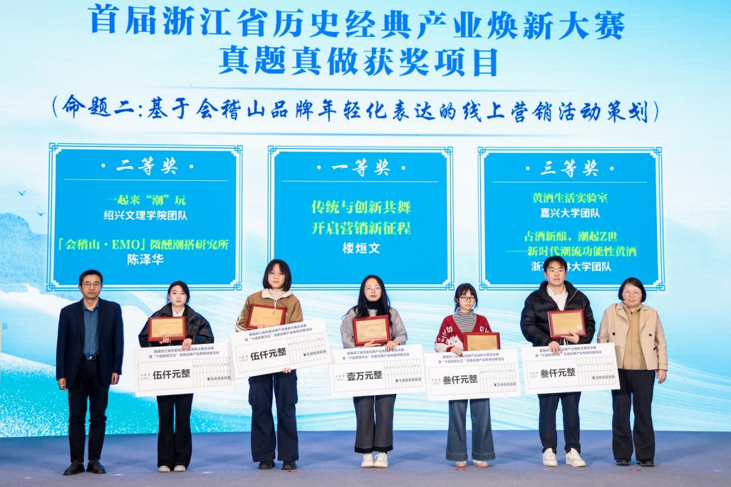 在“真题真做”子赛道“基于会稽山品牌年轻化表达的线上营销活动策划”中,由食健学院陶晗老师指导的项目《「会稽山·EMO」微醺潮搭研究所》荣获二等奖,该项目以会稽山气泡黄酒为核心,打造微信小程序,构建面向年轻群体的情绪疗愈与创意社交空间。由食健学院刘珂鑫老师指导的项目《古酒新酿,潮起Z世——新时代潮流功能性黄酒》荣获三等奖,该项目聚焦金线莲的护肝活性成分,研发新型功能性黄酒,以扎实研究成果与创意设计受到认可。