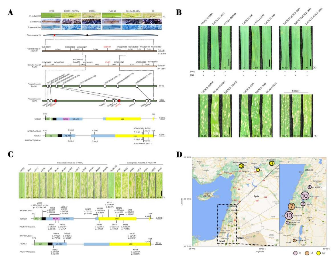 发表在《Nature Genetics》上的研究论文,揭示了野生二粒小麦来源的一对非典型的遗传连锁NLR(nucleotide-binding and leucine-rich repeat)基因TdCNL1和TdCNL5赋予MlIW170/Pm26位点对白粉病的抗性。图位克隆和PacBio HiFi长读长测序揭示,TdCNL1编码了具有钾依赖性钠钙交换器整合结构域(新型ID)的非典型CNL蛋白,而TdCNL5编码一个典型的CNL蛋白。突变体和病毒诱导基因沉默实验表明,TdCNL1或TdCNL5基因功能丧失或基因沉默均导致抗性丧失。单独转入TdCNL1或同时转入TdCNL1/TdCNL5的转基因植株表现出抗性,而仅含有TdCNL5的转基因植株则表现感病。研究结果揭示TdCNL1/TdCNL5二者在白粉病抗性表型中呈现功能互补性。从地理分布上看,MlIW170/Pm26仅存在于少数以色列南部野生二粒小麦种群中。该项工作发现了野生二粒小麦NLR pair协同调控白粉病抗性新范式,拓展了小麦NLR抗病蛋白抵御病原菌的科学认知,丰富了小麦抗病基因库,为广谱多抗品种精准设计奠定了理论和应用基础。