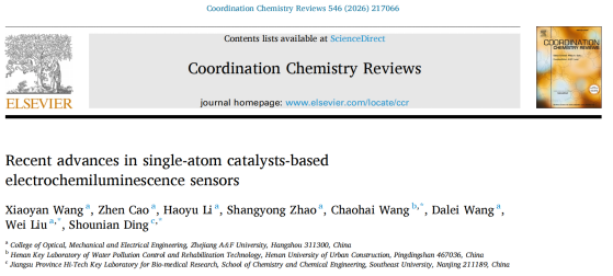 近日,先进光电子应用基础交叉研究中心在国际综述期刊《Coordination Chemistry Reviews》(中科院一区Top,IF=23.5)在线发表题为“Recent advances in single-atom catalysts-based electrochemiluminescence sensors”(基于单原子催化剂的电化学发光传感器研究进展)的综述论文。开云电竞s13为该论文第一单位和通讯作者单位。第一作者为该团队王晓艳博士;通讯作者为河南城建学院王超海教授、开云电竞s13刘威副教授及东南大学丁收年教授。
