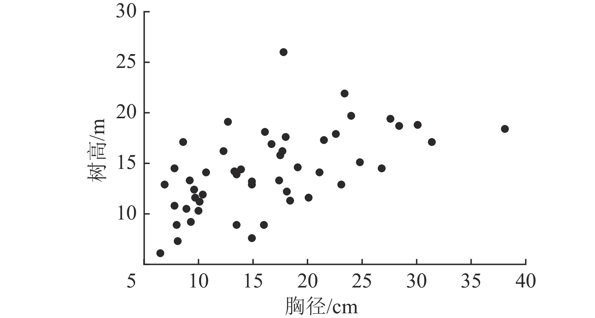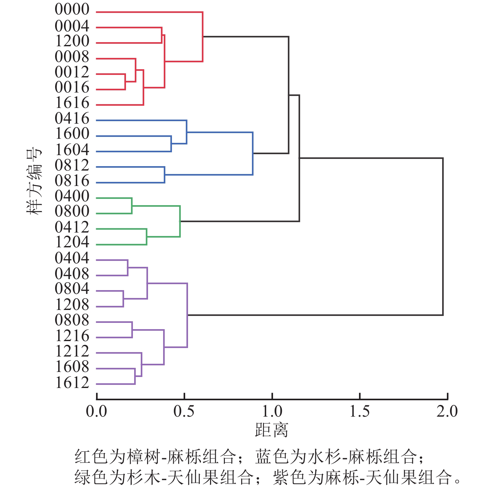 Ficus erecta等为该群落的主要优势树种。在科水平上,群落树种的世界分布占27.78%,热带成分占50.00%,温带成分占22.22%;在属水平上,热带成分占64.29%,温带成分占28.57%,中国特有占7.14%。样地树种径级结构呈倒“J”型分布,小径级和较小径级的植物数量占比达91.80%。群落Shannon-Wiener多样性指数、Pielou均匀度指数、Simpson多样性指数和Margalef丰富度指数分别为1.28、0.38、0.50、3.08。群落有樟树-麻栎、水杉
