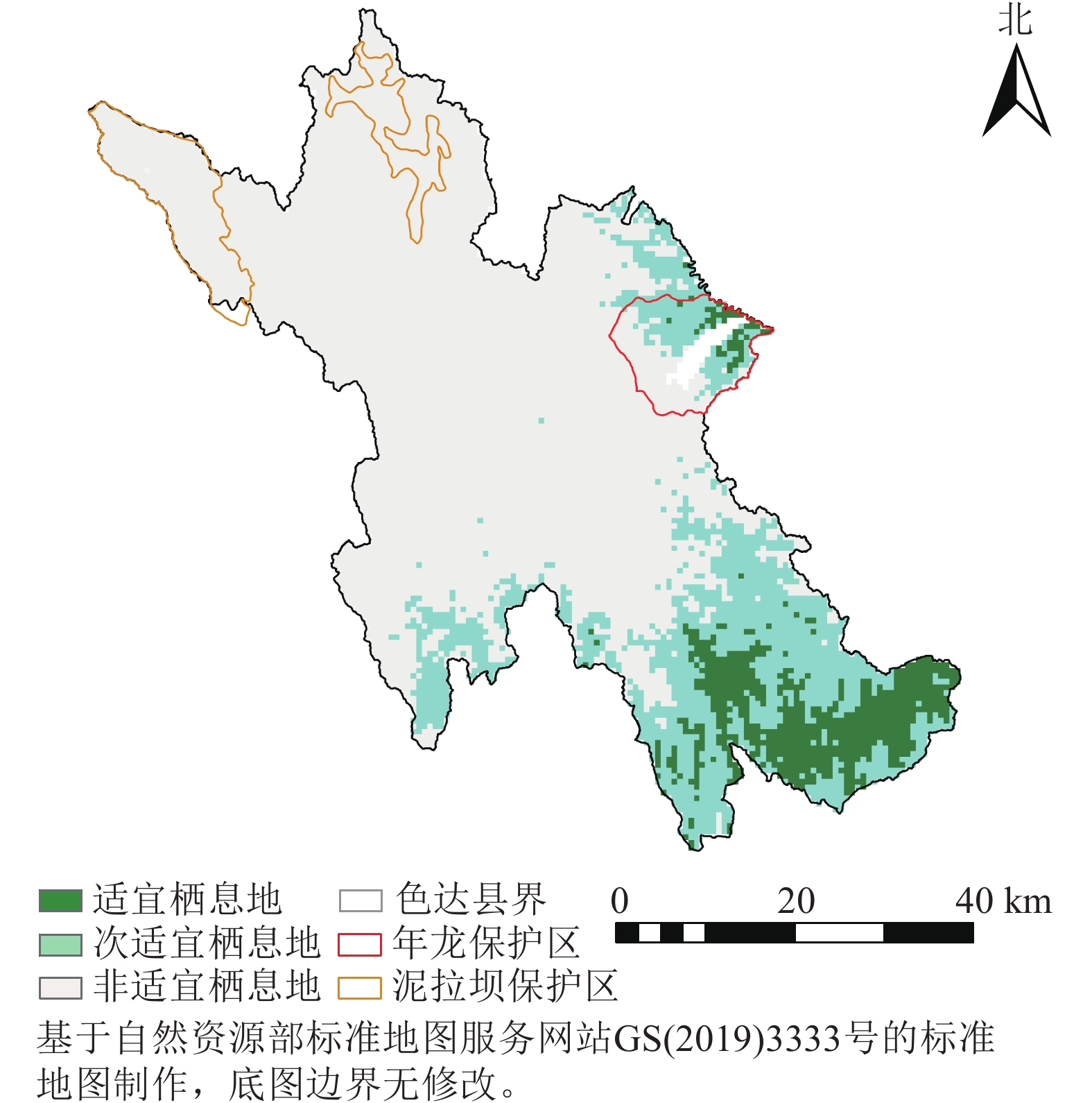 2,主要分布在色达县东侧和南侧;年龙自然保护区内适宜栖息地面积仅有40 km