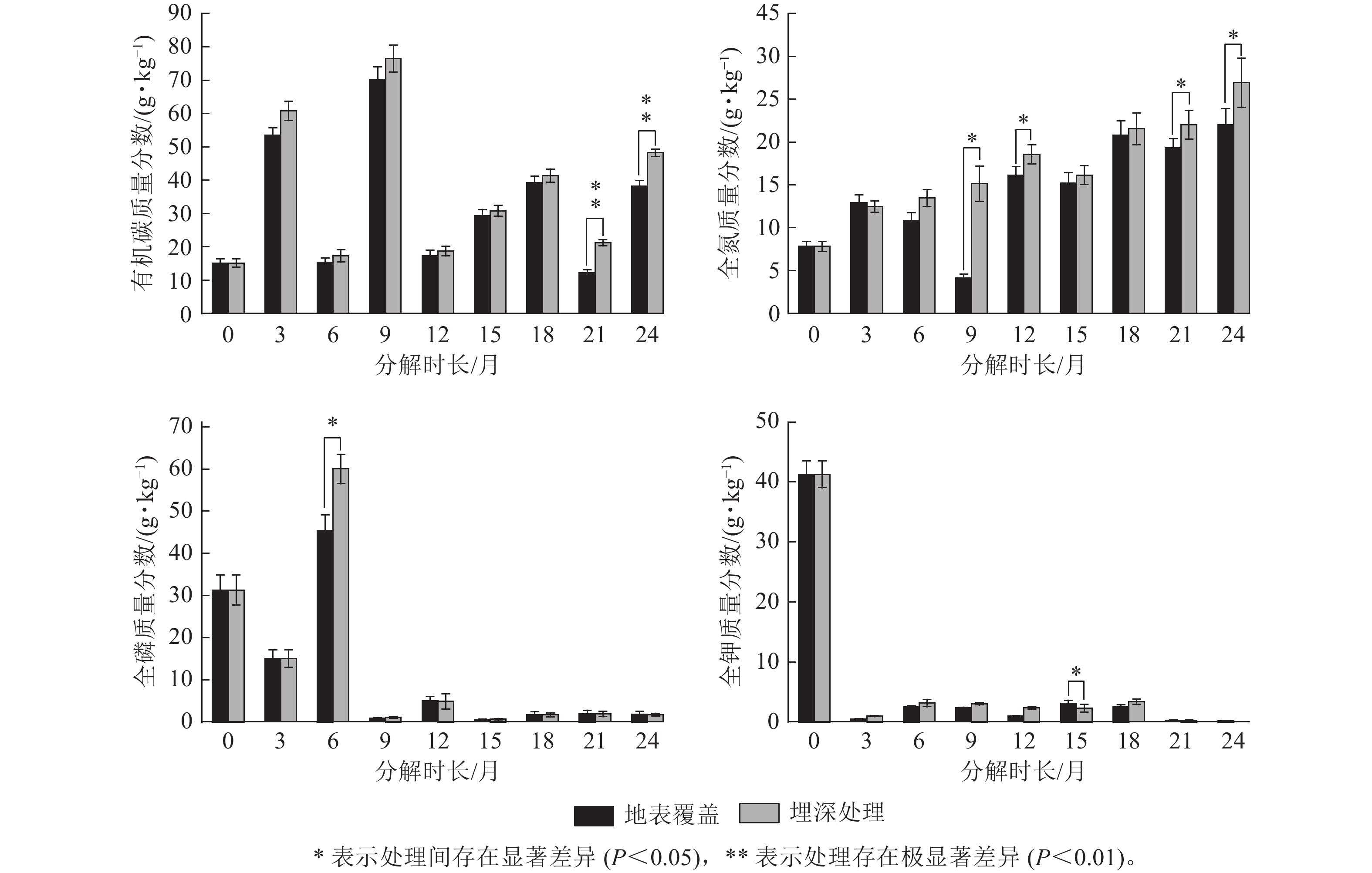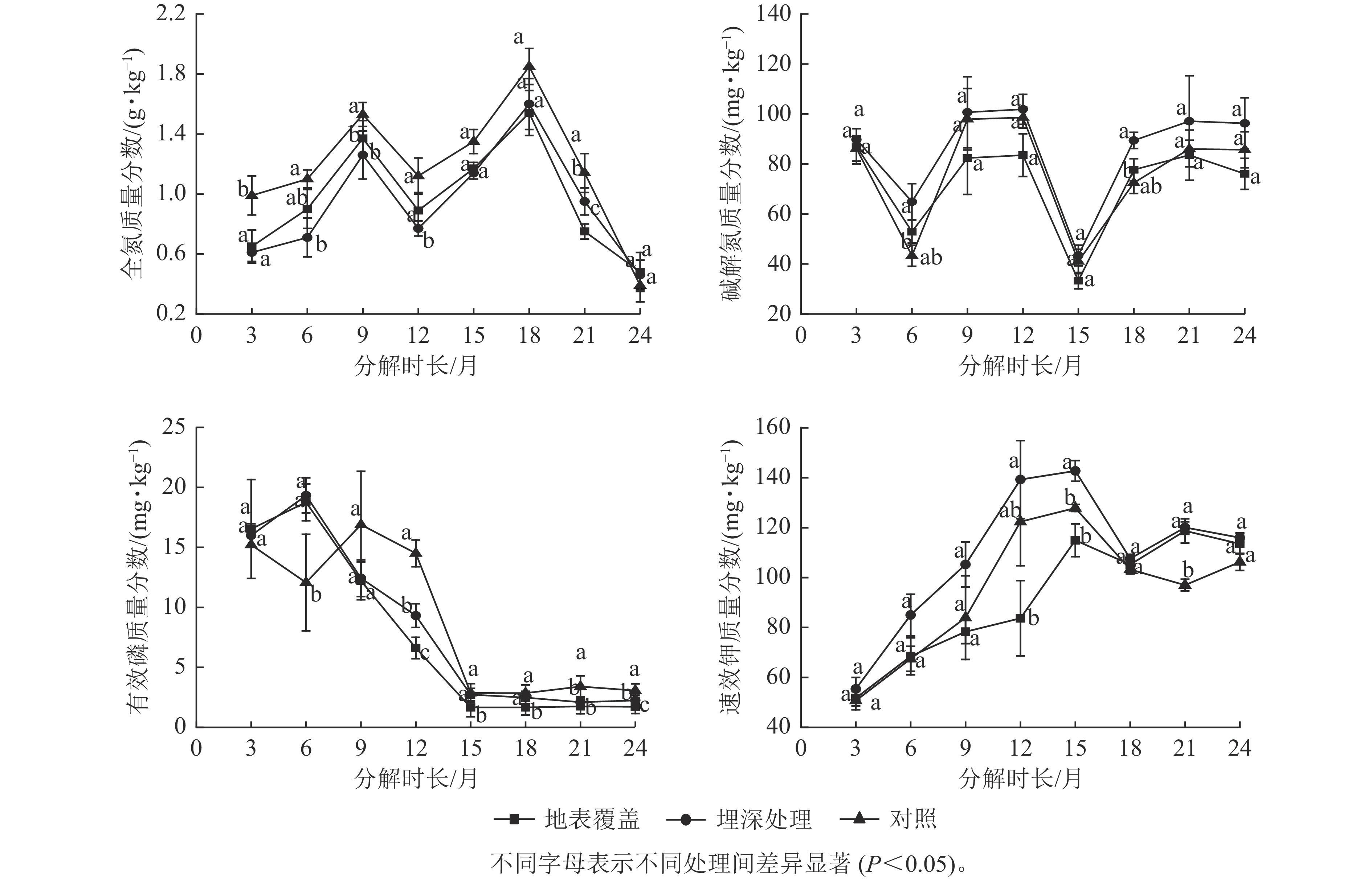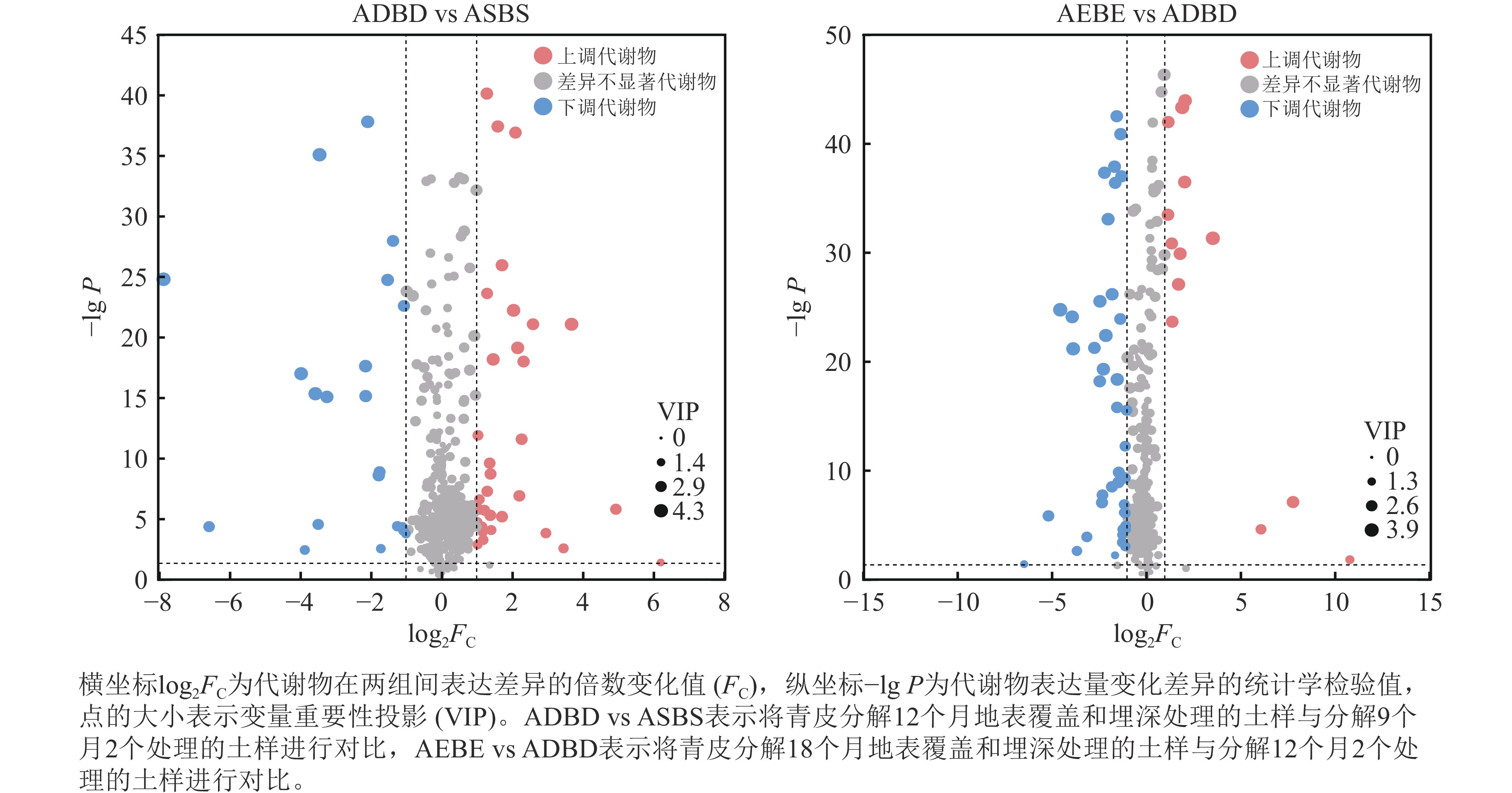 结果①在2 a分解期内,埋深处理的青皮分解速率始终快于地表覆盖,2种处理下的薄壳山核桃青皮总有机碳和磷表现为富集-淋溶模式,氮表现为富集模式,钾表现为净释放模式。②在2 a分解期内,对照处理的土壤全氮质量分数高于地表覆盖和埋深处理,埋深处理的土壤碱解氮质量分数和速效钾质量分数均高于地表覆盖;地表覆盖处理的土壤细菌数量大于埋深处理,地表覆盖处理的真菌和放线菌数量均小于埋深处理。③同一时期地表覆盖和埋深处理之间的土壤代谢物质差异较小,不同分解时期差异较大。将青皮分解第12个月与第9个月的土样进行相比,青皮分解第18个月与第12个月的土样进行相比,均筛选出54种差异代谢物,主要富集在嘧啶代谢、泛醌和其他萜类醌生物合成、类固醇激素生物合成、ABC转运蛋白等22条代谢通路中。