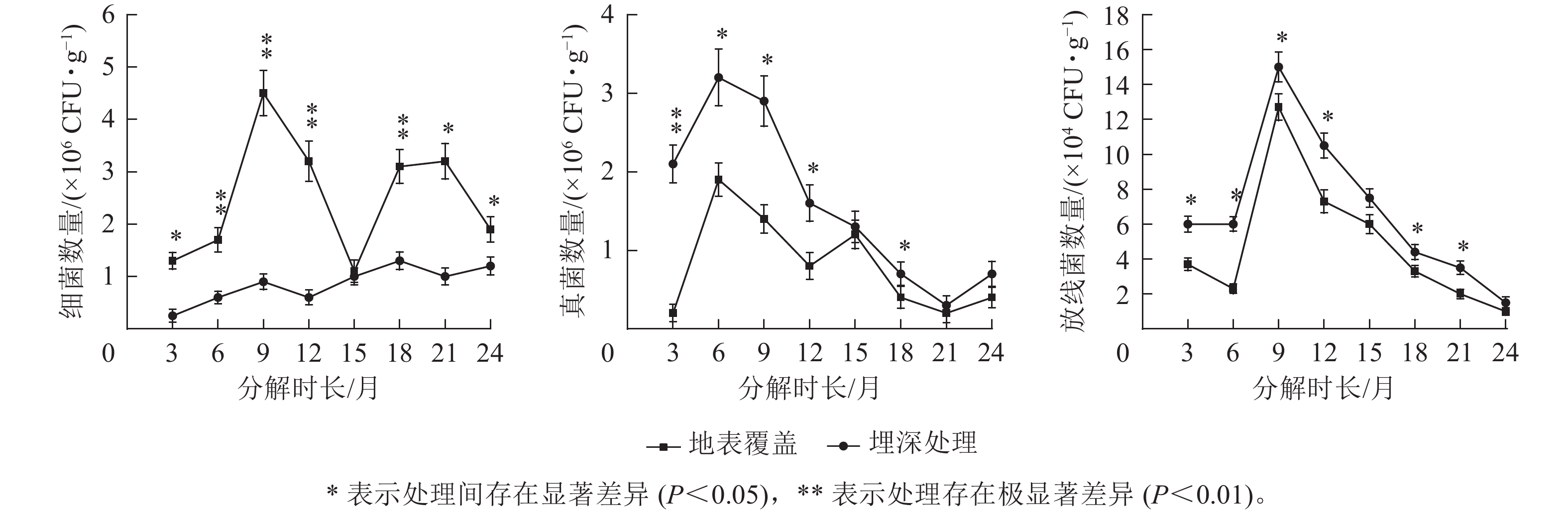 结论薄壳山核桃青皮在分解第9个月时养分流失较少,且土壤微生物数量最多,产生利于植物生长的土壤代谢物质,是对土壤肥力产生积极影响的最佳时期。图8表3参28