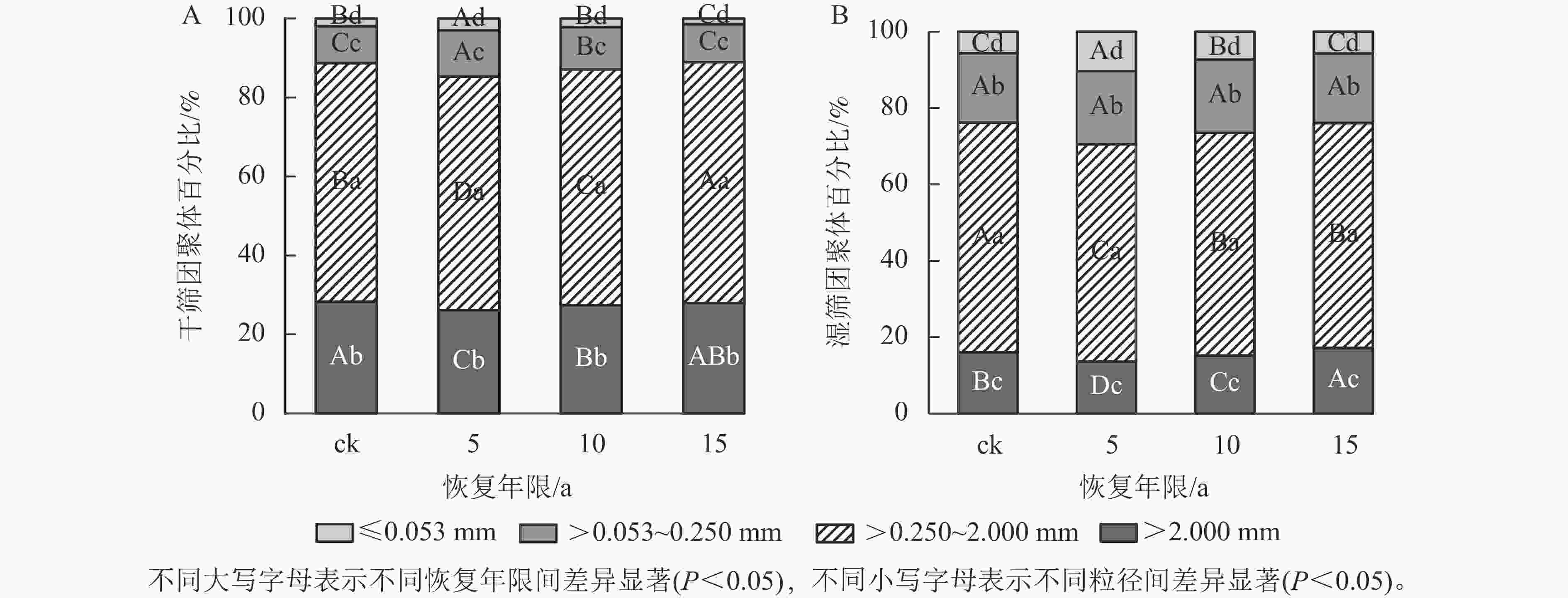 P<0.01),但恢复15 a时仍未恢复至自然边坡水平。②在恢复15 a时土壤有机碳含量、几何平均直径和平均质量直径相较5 a时分别增长了96.10%、12.17%和26.23%,这表明土壤团聚体的稳定性逐渐增强,在15 a时恢复至自然边坡水平。③植被特征和土壤指标对于土壤抗蚀和抗剪指标的解释率为83.42%。土壤可蚀性
