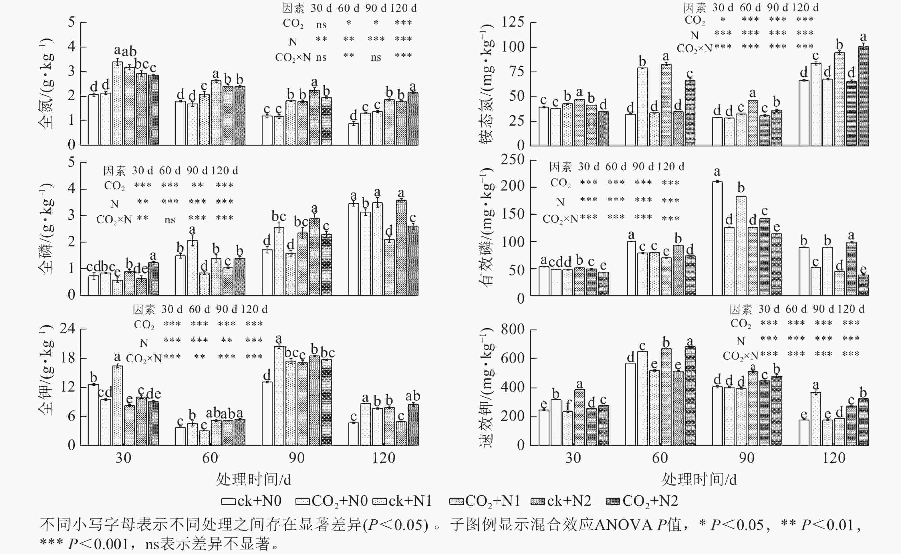 2摩尔分数升高和氮添加的交互作用对整个处理时期的土壤全钾、铵态氮、有效磷和速效钾质量分数有极显著影响(