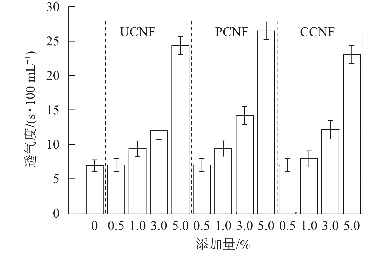 结果竹基CNF均可有效提升装饰原纸的干湿强度和助留性,其中,CCNF因更小的纤维直径和正电荷特性,在相同添加量下展现出更高的干湿强度、助留效果和空气透过率,当CCNF添加量为3.0%时,装饰原纸的干、湿强度和灰分质量分数分别提高了16.6%、22.7%和21.6%,透气度保持良好。PCNF在湿强度增强方面表现更佳,3.0%PCNF添加量的装饰原纸湿强度提高了35.1%,但助留效果一般。