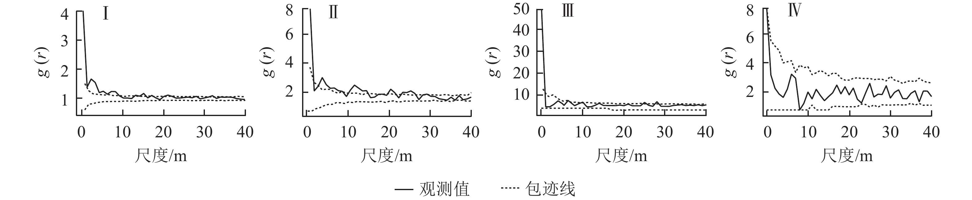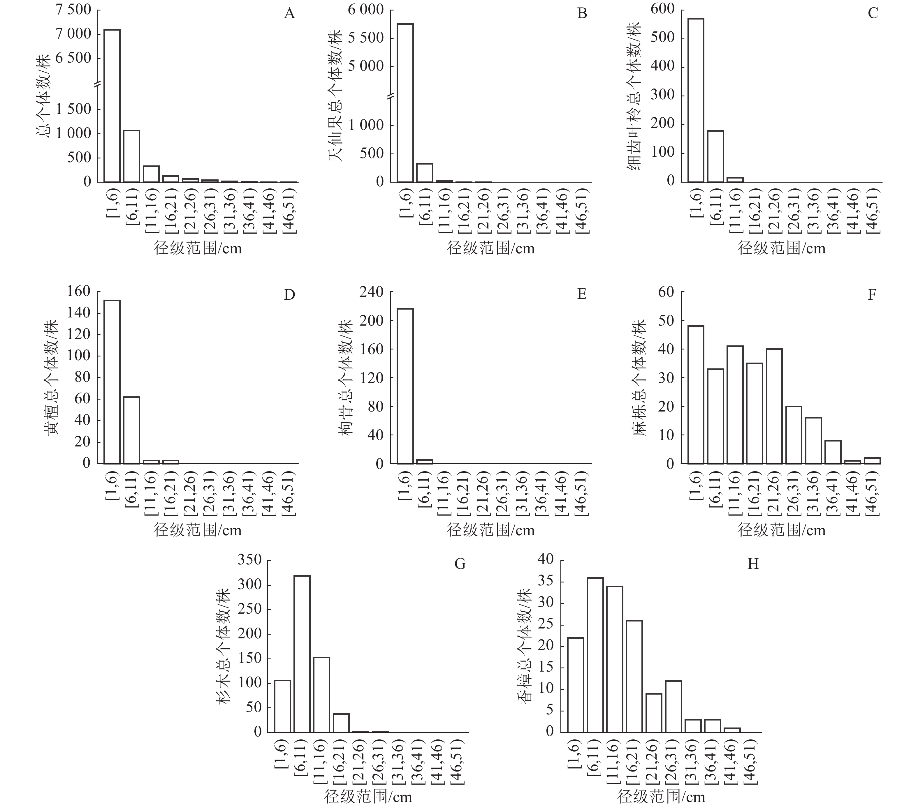 Ilex cornuta等为优势树种,径级结构呈现倒“J”型分布。该群落植物区系以热带成分占主导,群落整体上树种分布不均匀,形成了不同的树种组合。图4表4参30