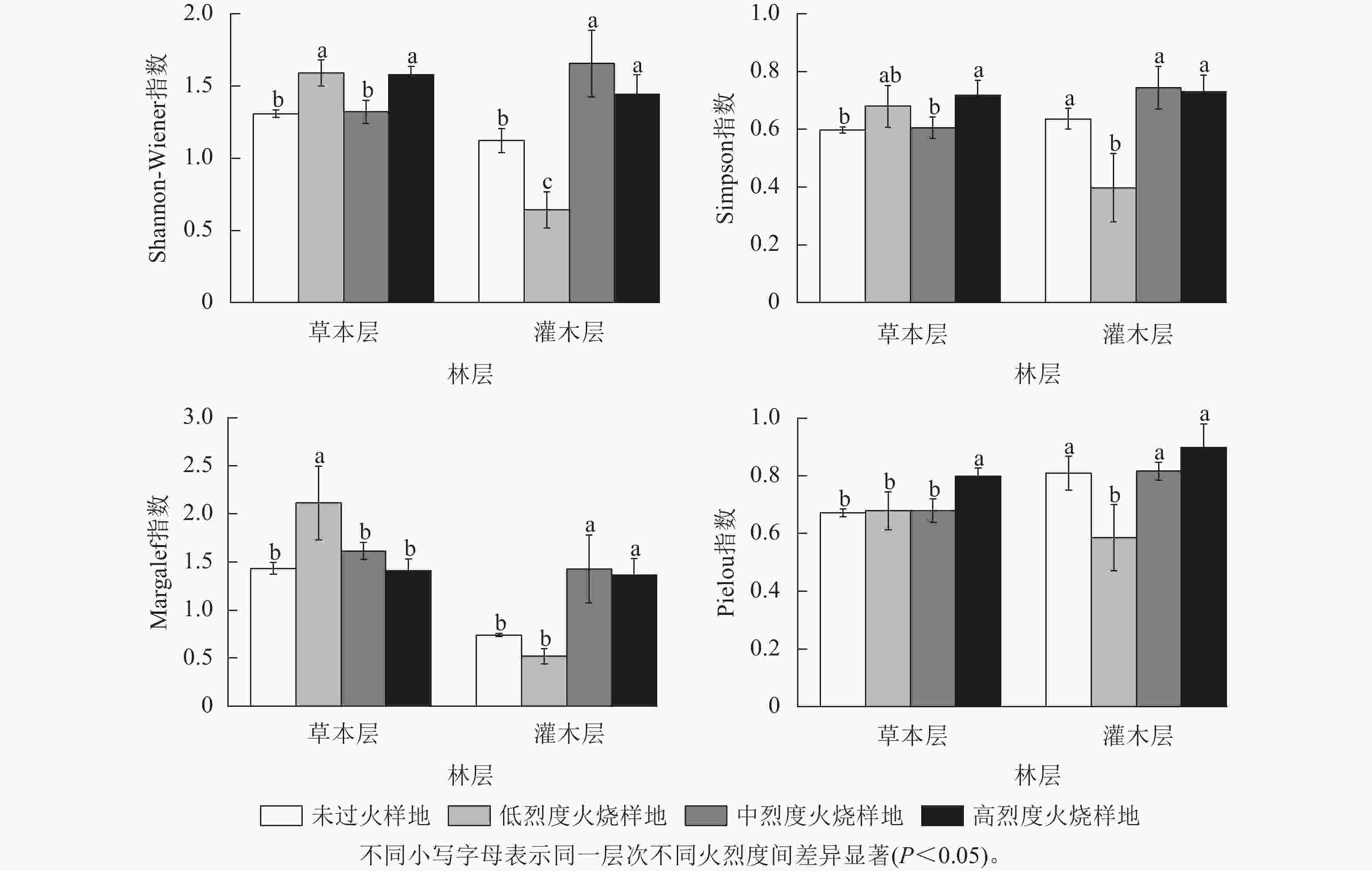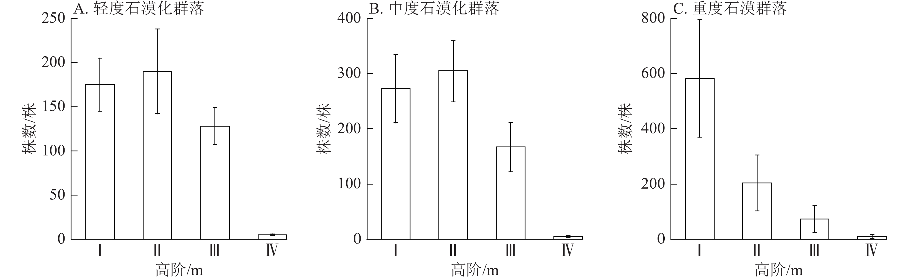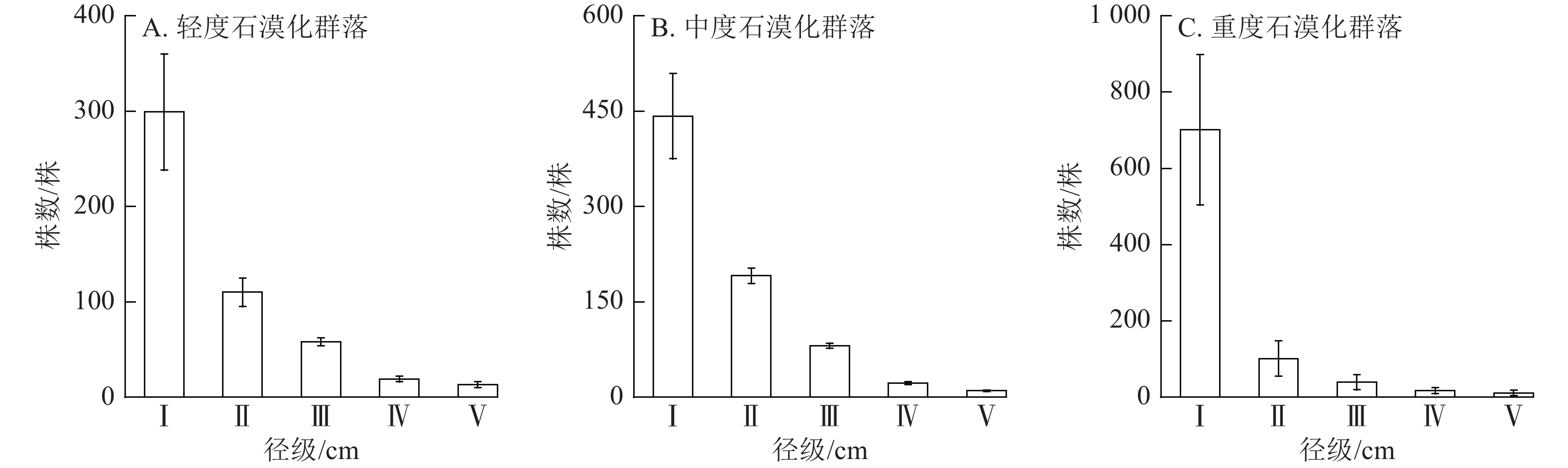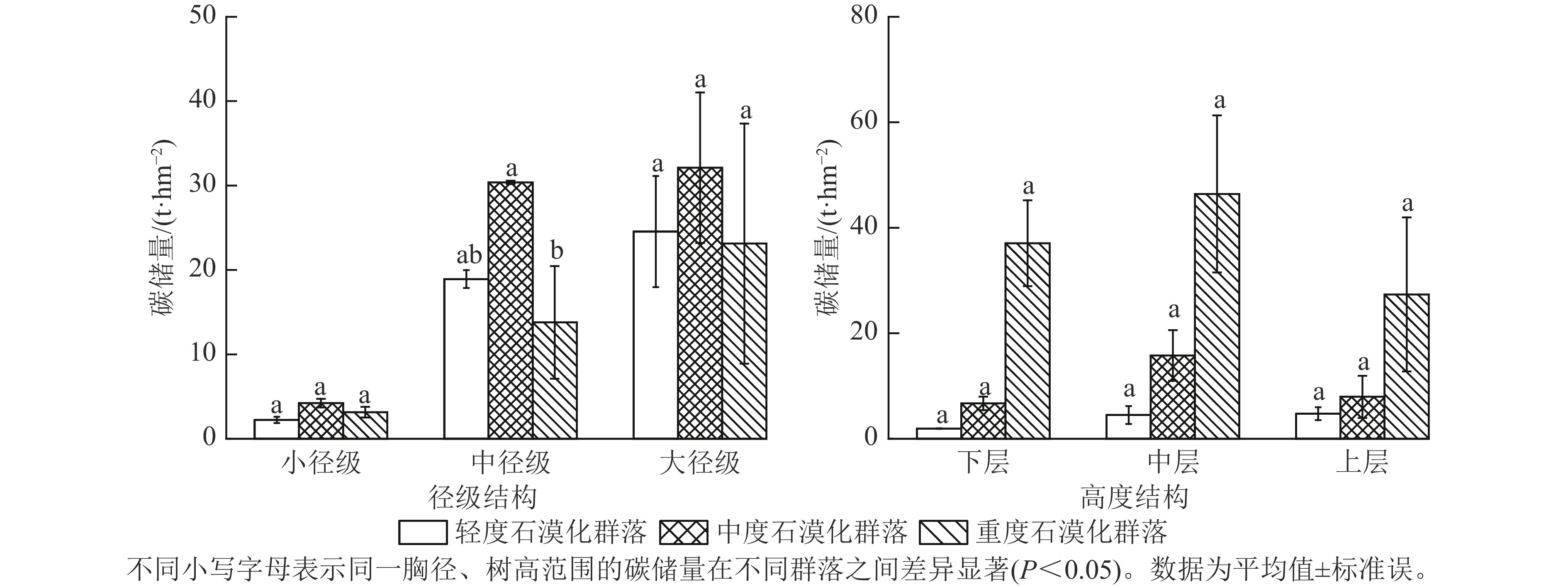 Quercus acutissima等, 中度石漠化群落物种多样性最高。② 3种石漠化程度的森林群落径级结构均呈现倒“J”型,其中径级Ⅰ个体占主导地位(轻度石漠化占53.8%、中度石漠化占67.8%、重度石漠化占77.4%),垂直结构以高阶Ⅰ、高阶Ⅱ为主,随着石漠化的加重,群落结构趋于简化;平均林分密度从大到小依次为重度石漠化群落、中度石漠化群落、轻度石漠化群落。③ 3种森林群落碳储量从大到小依次为中度石漠化群落、 轻度石漠化群落、重度石漠化群落,群落间碳储量差异未达显著水平,碳储量组分中枯死木、凋落物碳储量最少。④物种多样性与碳储量特征无显著相关;胸径和树高与碳储量特征呈显著正相关(