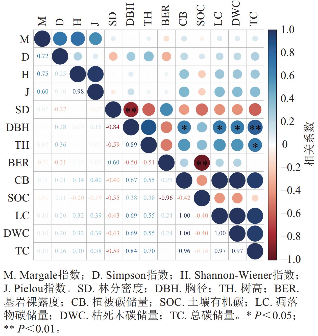 P<0.01),与总碳储量无显著相关;物种优势度指数、胸径、树高对碳储量相对重要性分别为21.23、19.95和19.55。