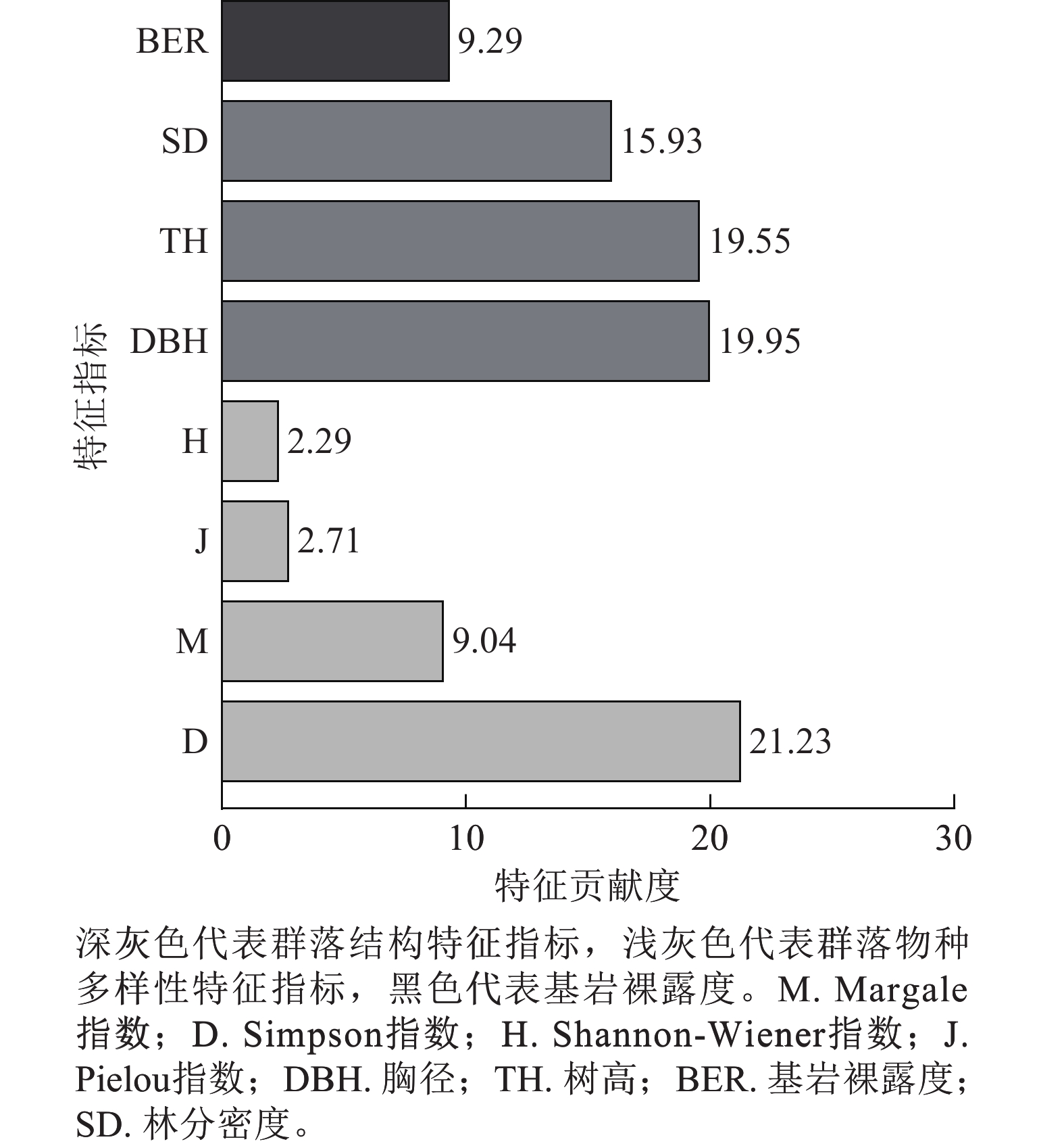P<0.05);林分密度与碳储量特征无显著相关;基岩裸露度与土壤碳储量呈极显著负相关(