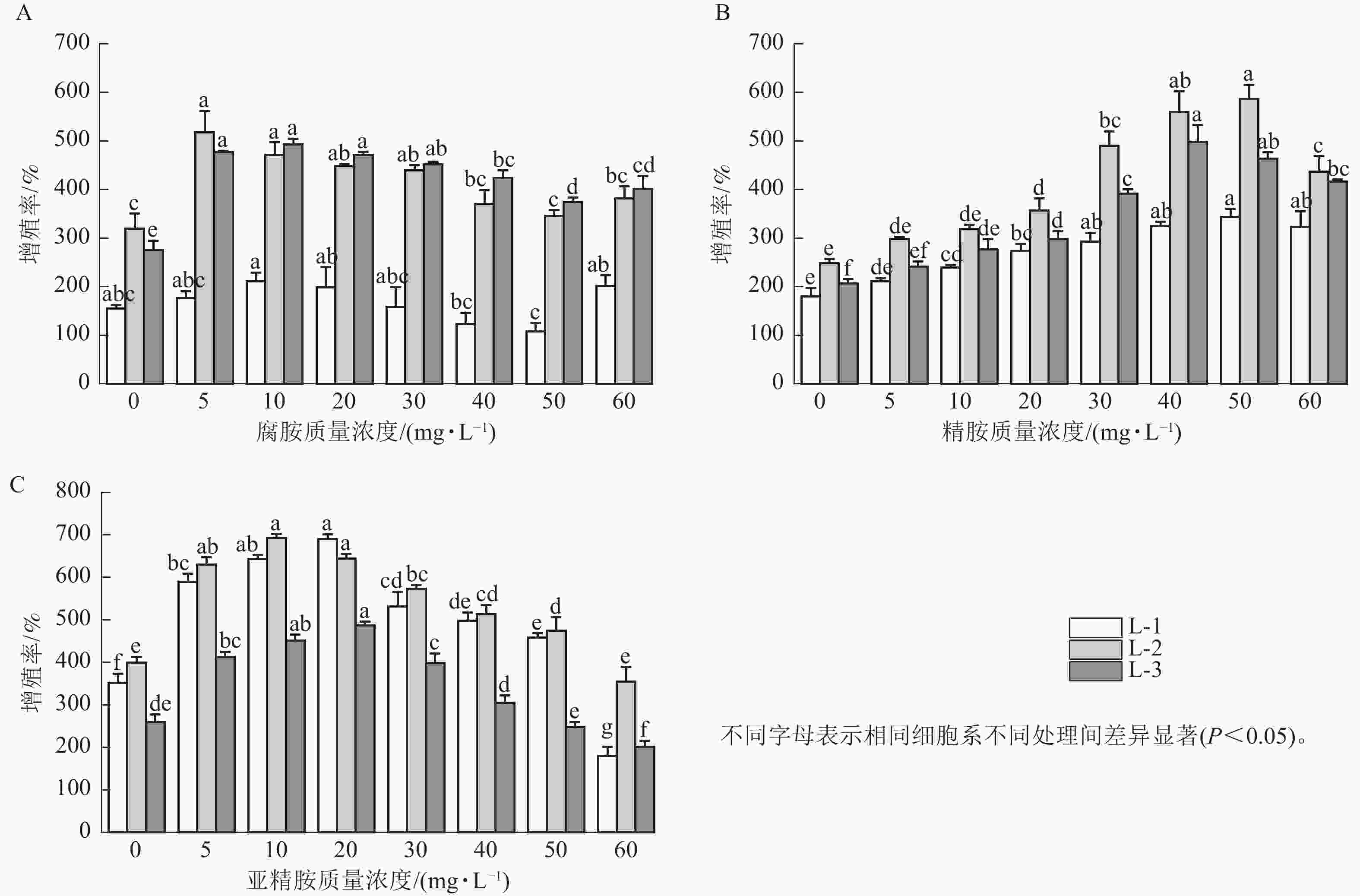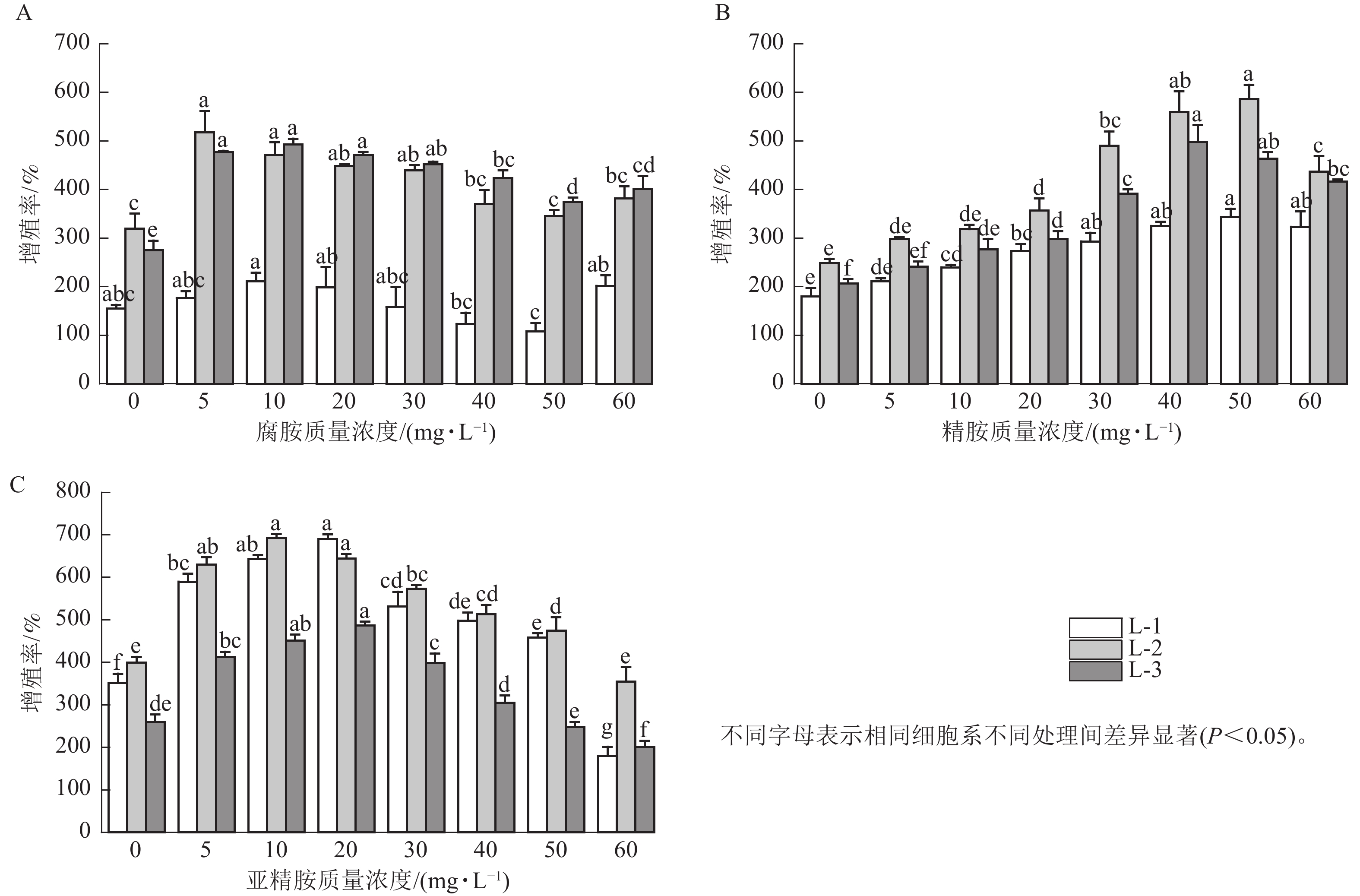 −1亚精胺促进效果最优,增殖率分别提升了2.22%~79.27%、80.56%~141.12%、61.25%~96.21%。此外,外源添加多胺显著降低了细胞内H
