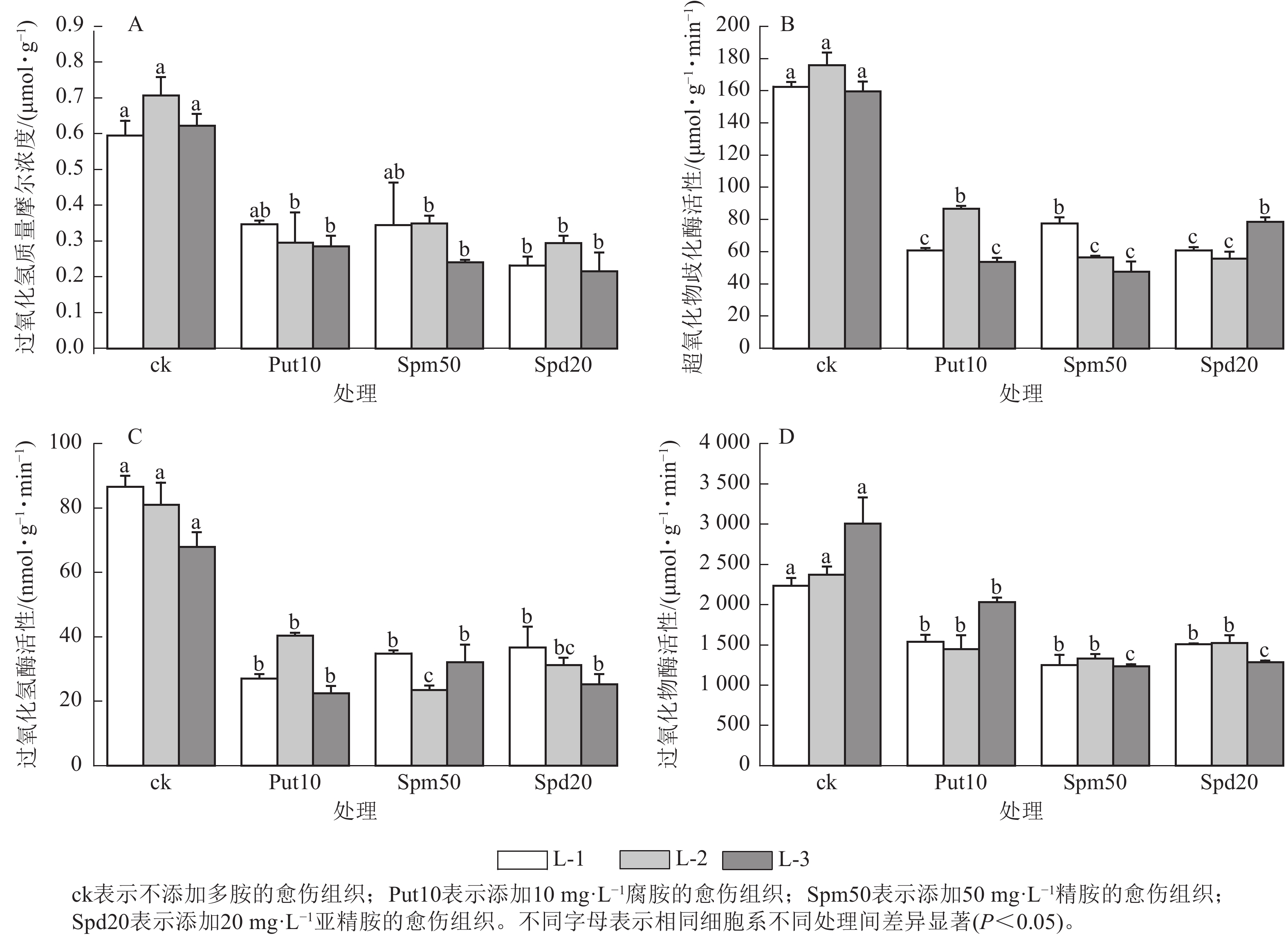 方法在增殖培养基中分别添加不同质量浓度的腐胺、精胺和亚精胺,统计红松胚性愈伤组织的增殖率,分析细胞内的过氧化氢(H