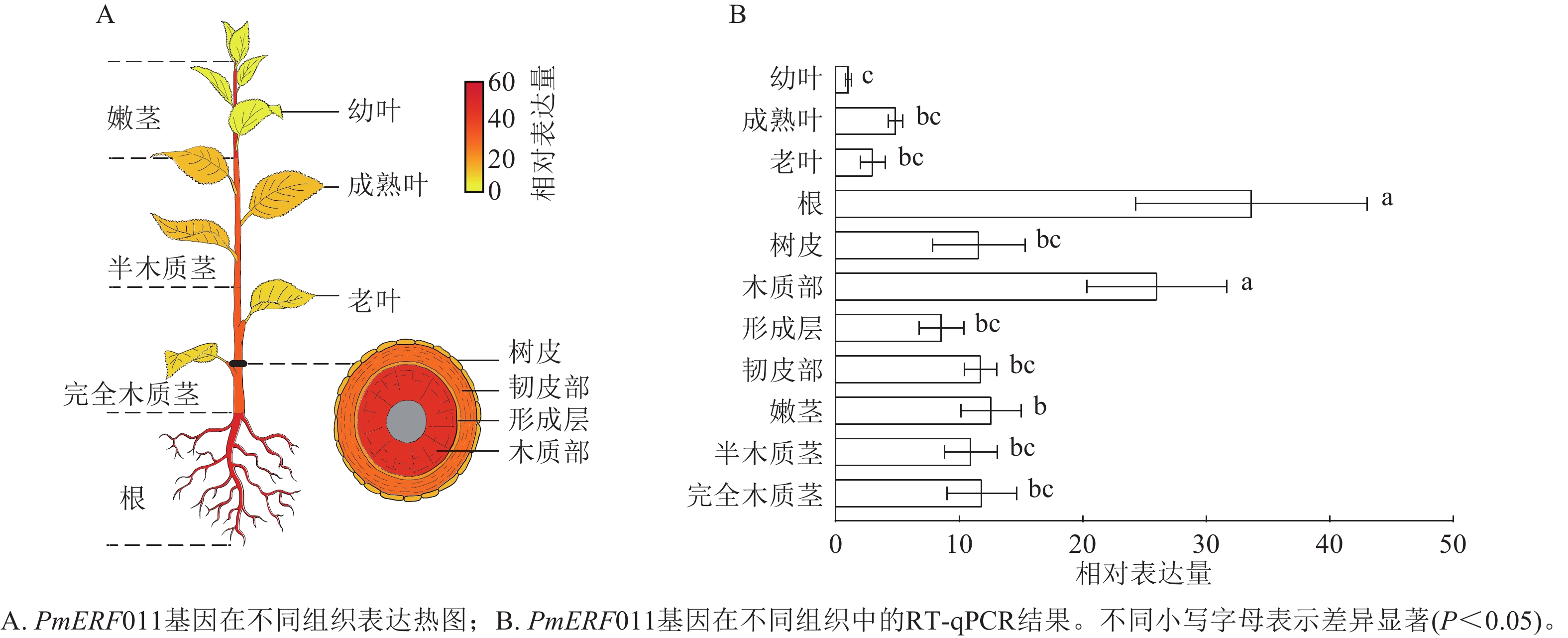 PmERF011基因序列,采用生物信息学方法分析其系统进化关系及启动子顺式作用元件;利用实时荧光定量PCR检测该基因在梅花不同组织(根、茎、叶)中的时空表达模式;构建过表达载体并转化拟南芥