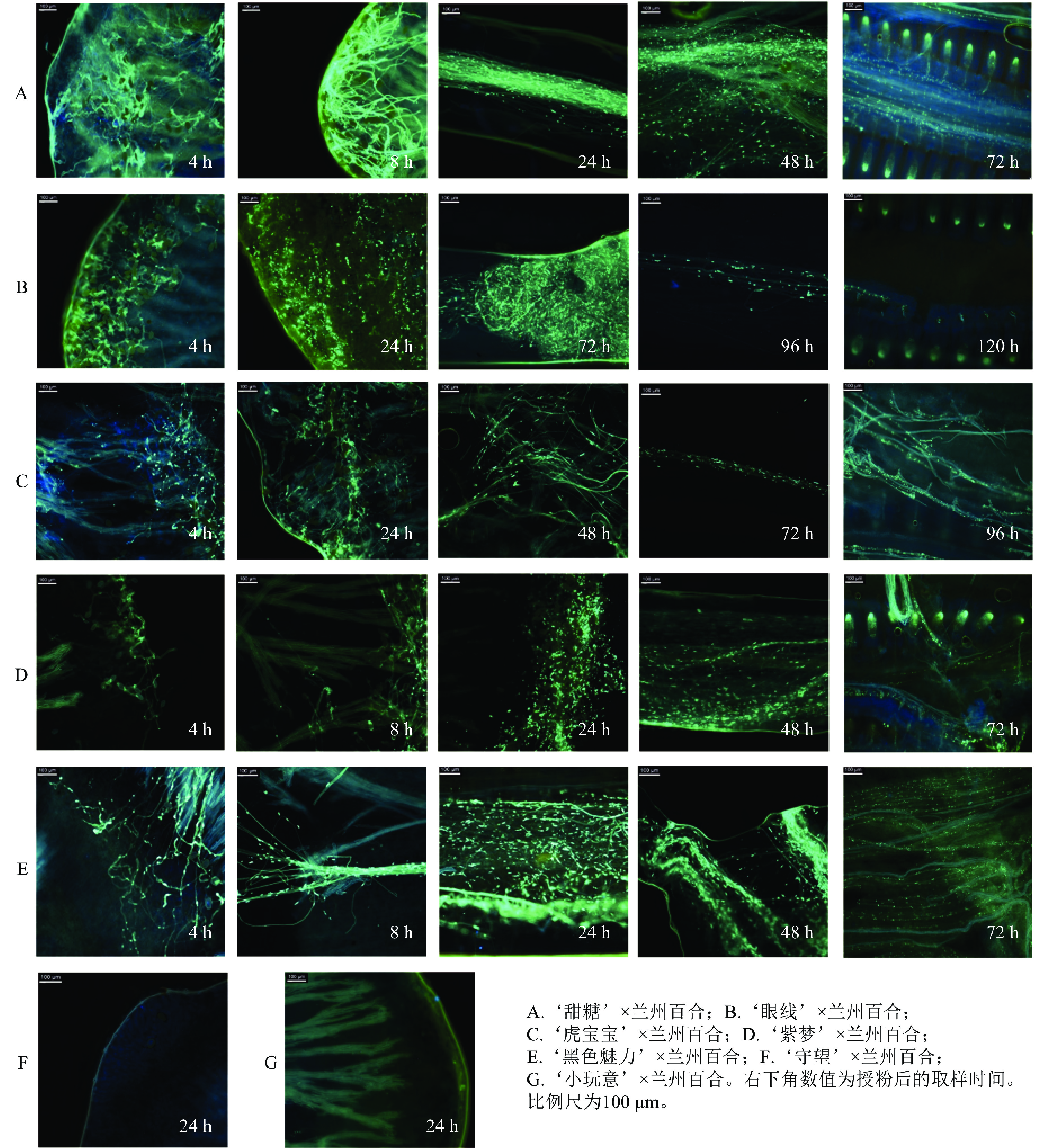 方法对所有供试百合花粉活力进行检验,根据结果配置以兰州百合为父本,‘虎宝宝’ ‘Tiger Babies’、‘紫梦’ ‘Purple Dream’、‘黑色魅力’ ‘Black Charm’、‘甜糖’ ‘Sweet Sugar’、‘眼线’ ‘Eye Liner’、‘小玩意’ ‘Gizmo’、‘守望’ ‘Watch Up’为母本,以及以兰州百合为母本,‘紫梦’‘黑色魅力’‘守望’为父本的10个杂交组合。采用直接授粉、切割柱头授粉、1 g·L