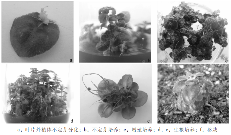 为了建立半蒴苣苔Hemiboea subcapitata的组培快繁技术体系,保护和开发利用半蒴苣苔这一民间植物药资源,以MS(Murashige and Skoog)为基本培养基,研究植物生长调节物质6-苄基腺嘌呤(6-BA)和萘乙酸(NAA)组合对叶片愈合组织诱导、不定芽分化,增殖和壮苗生根的影响,筛选出适合半蒴苣苔快繁的最适培养基。结果表明:叶片诱导愈合组织困难,但在叶片基部或切口处可直接诱导分化出不定芽,且随着6-BA 和NAA质量浓度的升高,芽的分化率先上升后降低,以MS+0.5 mg·L-1 6-BA+1.0 mg·L-1 NAA+1.5 g·L-1活性炭(AC)分化率最高,达到67.8%;但平均每外植体诱导芽数以MS+1.0 mg·L-1 6-BA +0.5 mg·L-1 NAA +1.5 g·L-1 AC最多,达到6.69个;不定芽增殖以MS+0.5 mg·L-1 6-BA+0.5 mg·L-1 NAA处理增殖倍数最高,达到23.43;在添加不同质量浓度吲哚丁酸(IBA)的培养基中生根率均超过90%。