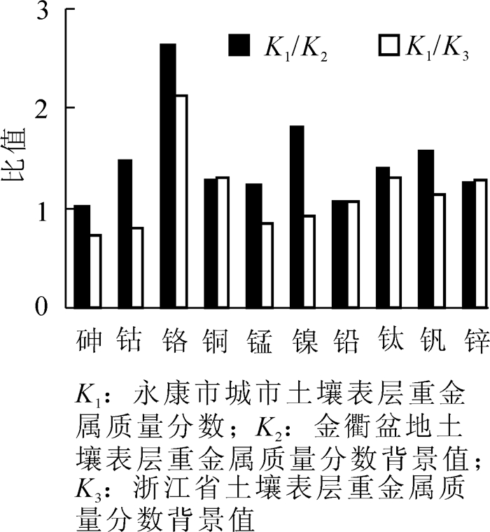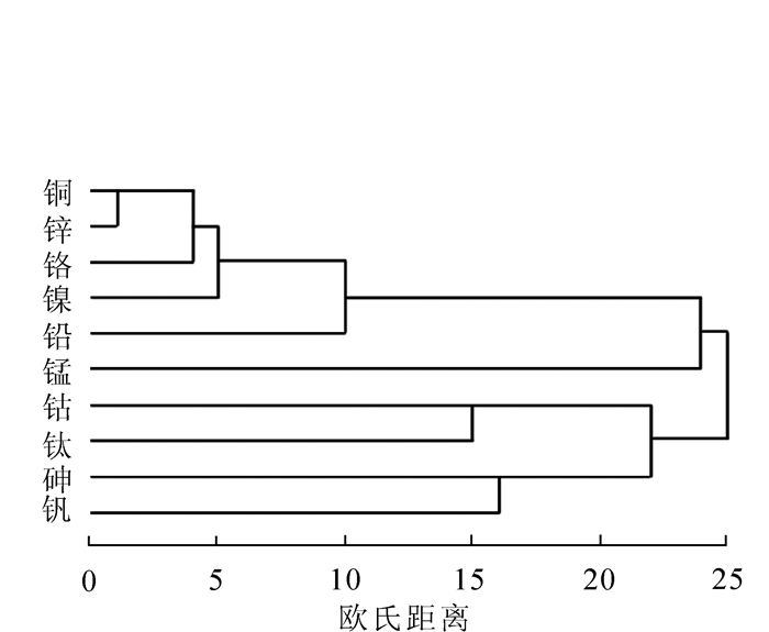 基于浙江省永康市市域范围内7种土地利用类型的采样点共计203个,利用描述性统计分析、单因素评价分析、内梅罗综合污染指数、相关性分析、主成分分析和聚类分析等方法对研究区土壤表层重金属质量分数、污染程度和重金属相关关系及来源进行研究。结果表明:①永康市城市土壤表层重金属砷(As),钴(Co),铬(Cr),铜(Cu),锰(Mn),镍(Ni),铅(Pb),钛(Ti),钒(V),锌(Zn)的平均质量分数为6.57,10.57,119.55,22.978,528.51,22.45,37.67,5751.81,84.37,90.25 mg·kg-1;②研究区表层土壤均呈现为轻度及以上污染水平,重金属元素的平均单因素污染指数由大到小依次为铬>镍>钒>钴>钛>铜>锌>锰>铅>砷;平均内梅罗综合污染指数由高到低排序为工业用地>交通用地>公园绿地>住宅用地>林地>市政文教用地>耕地。③永康市城市土壤表层中铬、铜、镍、铅、锌元素主要来源与当地的五金制造业和交通运输,砷和钒主要来源于工业与自然成土过程中的元素积累,钴和钛主要来源于五金制造业。图2表8参22