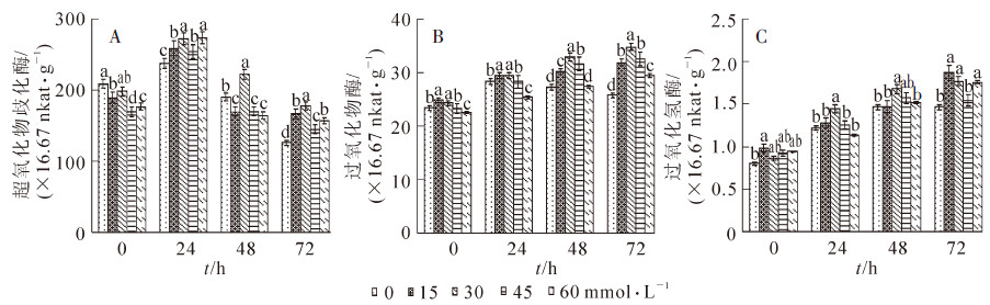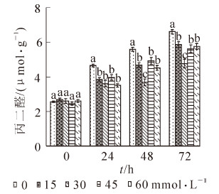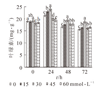 为研究高温胁迫下水杨酸(SA)对菊花Chrysanthemum × morifolium幼苗热伤害的缓解作用,以扦插40 d的夏菊幼苗为材料,向叶片喷施不同浓度[0(空白),15,30,45,60 mmol·L-1]的水杨酸溶液,研究在不同高温时间[0(对照),24,48,72 h]处理下叶片叶绿素、丙二醛、脯氨酸、可溶性糖和可溶性蛋白的含量,以及超氧化物歧化酶(SOD),过氧化物酶(POD),过氧化氢酶(CAT)的活性。结果表明:喷施水杨酸能够减轻菊花叶片叶绿素质量分数的降低速度,用30 mmol·L-1水杨酸处理72 h后叶片叶绿素质量分数仅比对照(未进行高温处理)降低了1.7%;高温处理后,使用不同浓度的水杨酸处理能够减轻菊花叶片丙二醛质量摩尔浓度的增加,增加脯氨酸、可溶性蛋白、可溶性糖的质量分数,以30 mmol·L-1的水杨酸处理72 h的效果最好。菊花叶片丙二醛质量摩尔浓度仅比对照增加了86.8%,为4.76 μmol·g-1,脯氨酸、可溶性糖、可溶性蛋白的质量分数则分别增加了94.3%,112.1%和80.0%,均高于其他处理;高温处理后,SOD活性呈现先升高再降低的趋势,POD和CAT活性逐渐升高,而且30 mmol·L-1水杨酸对于SOD和POD的影响最为明显,15 mmol·L-1水杨酸对于CAT的影响最显著。结果表明:短期高温胁迫引起了菊花叶片的叶绿素、可溶性渗透调节物质和抗氧化系统都受到了不容程度的伤害,水杨酸能起到一定的保护作用,减轻高温对叶片的影响。图4参14
