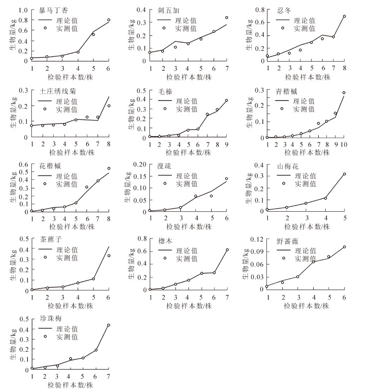 为了研究吉林省汪清县金沟岭林场林下灌木的生物量,以该林场3种不同郁闭度(0.6,0.8,1.0)的天然红皮云杉Picea koraiensis,鱼鳞云杉Picea jezoensis和冷杉Abies nephrolepis林为研究对象,以灌木生物量实测数据为基础,用R软件拟合了灌木层出现频率较高的13个物种单一物种生物量最优模型和各物种不同器官的最优模型,挑选判定系数R2和方差分析F值较大,剩余标准差ESEE和平均相对误差E值较小的作为生物量最优模型,以及探索了不同主林层密度下各物种生物量的差异与分配。结果表明:各物种不同器官最优模型除了青楷槭Acer tegmentosum叶和根,花楷槭Acer ukurunduense干为幂函数外,其他多为一元二次方程或二元一次方程;单一物种混合模型多为一元二次方程或二元一次方程。枝、干最优模型的自变量多为D2H(D为地径,H为株高)和CH(C为冠幅,H为株高);根系多采用因子D2H。林下灌木生物量(W)随着林分密度的减小,出现先减小后增大的趋势,即W(0.6)>W(1.0)>W(0.8)。图2表4参27