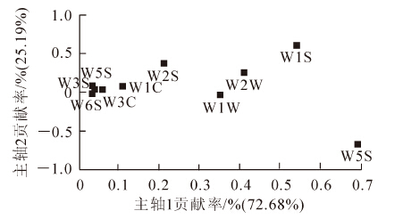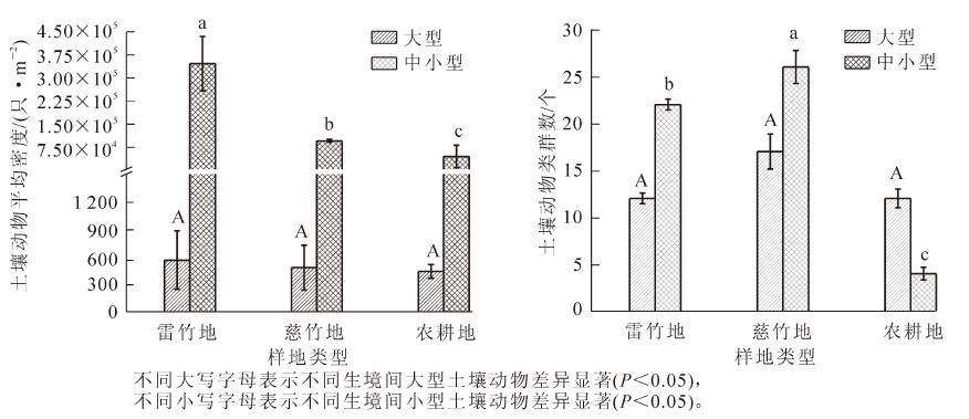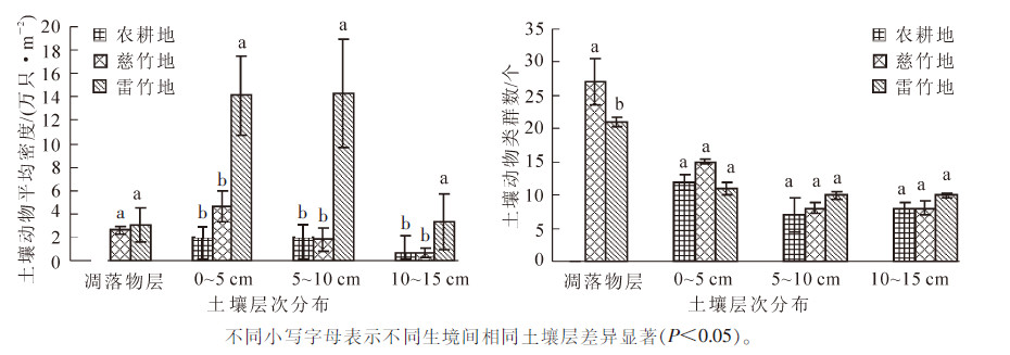 为了解雷竹Phyllostachys violascens引种栽培对当地土壤动物群落结构的影响,于2014年10月,以毗邻乡土竹类慈竹Neosinocalamus affinis和农耕地为对照,采用手捡法和干湿漏斗法对土壤动物群落进行调查。结果显示:实验共收集到土壤动物3 477只,隶属于3门9纲24目;土壤动物平均密度排序为雷竹(3.47×105只·m-2)>慈竹(9.65×104只·m-2)>农耕地(4.58×104只·m-2),类群数为慈竹(30个)>雷竹(28个)>农耕地(15个),其中,各样地间土壤动物平均密度和类群数差异显著(P<0.05)。密度-类群指数(IDG)以雷竹和慈竹样地显著高于农耕地(P<0.05),各样地土壤动物丰富度指数(D)和多样性指数(H′)存在显著差异(P<0.05),其余各指数差异不显著(P>0.05);各样地土壤动物垂直分布均呈现表聚性分布特性;雷竹与慈竹样地土壤动物的群落相似性较高,各样地土壤动物的相似性指数均表现为随土层深度的增加而降低。雷竹的引种栽培对当地土壤动物群落分布与多样性特征产生了一定影响。图2表5参32