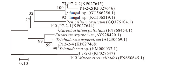 应用平板分离培养和内转录间隔区(internal transcribed spacers,ITS)序列分析的方法,筛选鉴定集约栽培雷竹Phyllostachys violascens林土壤中染料降解真菌菌株,并通过摇瓶发酵研究其染料脱色效果。结果表明:土壤样品中分离频次最高的真菌种类为木霉菌属Trichoderma,对5 株接种到苯胺蓝平板上能形成明显水解圈的真菌分离物,测试它们对偶氮和三苯甲烷类染料的降解能力。综合脱色效果较好的菌株为P7-2-3和P12-2-4,ITS序列比对和形态学观察表明菌株分别是卷枝毛霉Mucor circinelloides和木霉菌Trichoderma sp.,接种不超过500.0 mg·L-1质量浓度结晶紫染料液体发酵脱色均可获得较高的脱色率;但染料质量浓度为300.0 mg·L-1和400.0 mg·L-1时分别对2菌株的脱色能力产生明显抑制,降解染料质量与菌丝生物量之间存在显著的正相关性。图4表2参31