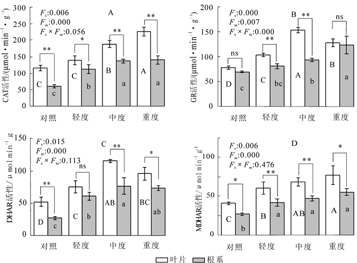 放牧对草地植物的直接影响包括动物的采食和践踏。为了探讨冷蒿Artemisia frigida的耐牧性,采用人工机械损伤(轻度、中度和重度)的方式处理盆栽冷蒿地上枝叶,分别测定冷蒿叶片和根系活性氧(ROS),丙二醛(MDA),抗坏血酸(AsA)和谷胱甘肽(GSH)质量摩尔浓度,同时测定了抗氧化防御酶和抗坏血酸(AsA)-谷胱甘肽(GSH)循环酶活性的变化。结果表明:随着机械损伤强度的增加,冷蒿叶片超氧阴离子(O2·-)和过氧化氢(H2O2)质量摩尔浓度升高,膜质过氧化增强;超氧化物歧化酶(SOD),过氧化氢酶(CAT)和过氧化物酶(POD)活性随机械损伤强度的增加而升高。在轻度和中度处理下,冷蒿叶片中抗坏血酸过氧化物酶(APX),脱氢抗坏血酸还原酶(DHAR),单脱径抗坏血酸还原并(MDHAR)和谷胱甘肽还原酶(GR)活性增强,抗氧化剂(AsA和GSH)的还原力(ρAsA/ρDHA值和ρGSH/ρGSSG值)处于稳定平衡状态;重度机械损伤下AsA-GSH循环效率显著降低(P≤0.05)。冷蒿根系抗氧化防御系统对机械损伤也表现出明显的应激反应能力。综上所述,机械损伤使冷蒿体内ROS质量摩尔浓度升高,且冷蒿能够在不同程度的机械损伤下快速、有效地启动体内抗氧化防御系统,清除体内过量的ROS,维持一定的AsA-GSH循环效率,表现出较强的耐损伤能力。图4表1参42