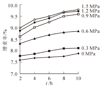 针对重组竹方材含水率低、密度大且难刨切的现状,采用不同压力的加压浸注和不同温度的水煮软化工艺对重组竹方材进行增湿软化处理,研究增湿软化后重组竹方材的增重率、传热及硬度的变化情况。研究结果表明:随着压力的增大和时间的延续,重组竹方材的增重率逐步增大,压力1.2 MPa以后增重率增加不明显;随着水煮软化温度的升高和时间的延续,重组竹方材的增重率变化率呈增大的趋势,36.0 h后增大趋势变缓;重组竹内部温度在8.0 h时已趋于稳定。硬度测试结果表明,经过加压浸渍和水煮软化后,重组竹材的硬度下降明显,和未处理材相比下降了36.2%,而重组竹表面的裂纹长度和宽度有所增加,和未处理材相比裂纹平均长度增加了21.1%,平均宽度增加了16.7%。说明采用加压浸注和水煮软化的生产工艺能对重组竹方材起到较好的软化效果,但也在一定程度上影响了其表面的裂纹长度和宽度。图4表2参16