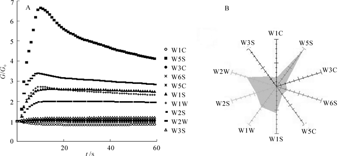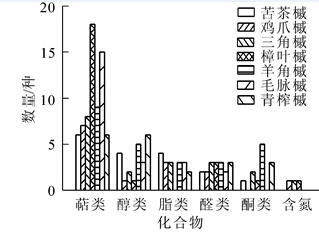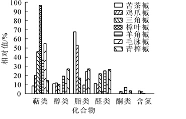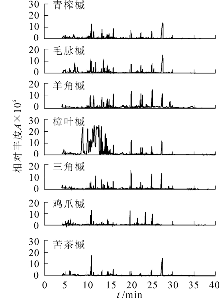 为探讨槭树Acer spp.释放挥发性有机化合物(VOCs)的组分,采用动态顶空气体循环法对苦茶槭A. ginnala,鸡爪槭A. palmatum,三角槭A. buergerianum,樟叶槭A. cinnamomifolium,羊角槭A. yangjuechi,毛脉槭A. pubinerve和青榨槭A. davidii等7种植物释放VOCs进行收集,利用热脱附/气相色谱/质谱(TDS-GC-MS)联用技术对其组分进行分析。结果表明:不同树种释放VOCs种类与相对含量差异明显。苦茶槭和青榨槭分别释放17种和20种成分,以酯类、醛类和醇类物质为主,相对含量较多的有乙酸叶醇酯、癸醛、(Z)-3-己烯-1-醇和壬醛;鸡爪槭、三角槭和毛脉槭分别释放15种、19种和23种成分,以萜类、酯类和醛类物质为主,相对含量较多的为罗勒烯、乙酸叶醇酯、癸醛、长叶烯和壬醛;樟叶槭释放24种成分,以萜类化合物为主,相对含量较多的有罗勒烯、α-蒎烯、3-蒈烯、β-蒎烯和松油烯;羊角槭释放25种成分,以萜类、醛类和醇类物质为主,相对含量较多的有癸醛、长叶烯、2-乙基-1-己醇、石竹烯和壬醛。以上7种槭树均可作为保健型园林植物材料。图3表1参29