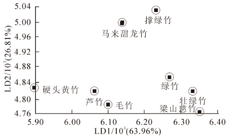 通过电子鼻技术检测不同竹笋间气味的差异性,以便初步建立一种可以快速区分竹笋种类的科学方法。以壮绿竹Dendrocalamopsis valida,绿竹Dendrocalamopsis oldhami,梁山慈竹Sinocalmus affinis,马来甜龙竹Dendrocalamus aspera,芦竹Arundo donax,撑绿竹Bambusa pervariabilis×Dendrocalamopsis grandis,硬头黄竹Bambusa rigida和毛竹Phyllostachys edulis等8种竹笋为实验对象,采用电子鼻对它们具有特殊气味的挥发性气体进行分析检测,通过主成分分析法(PCA),线性判别法(LDA)和分层聚类分析(HCA)对8种竹笋样品进行了分析。结果表明:通过电子鼻技术,8种竹笋能准确地被区分,且各种竹笋气味间存在差异性。通过Loading分析表明传感器贡献率较大的是传感器W5S和传感器W1S。电子鼻技术可以应用于不同竹笋种类的区分和鉴别。图5表3参15