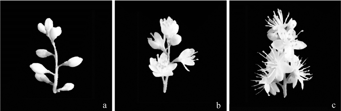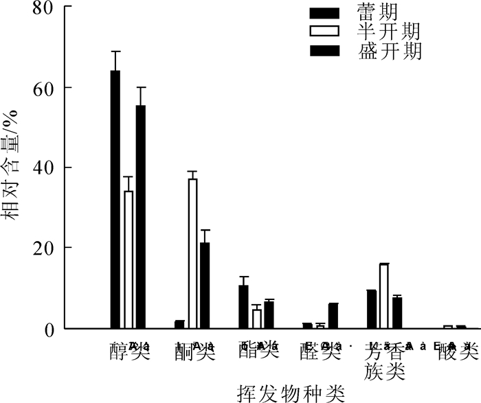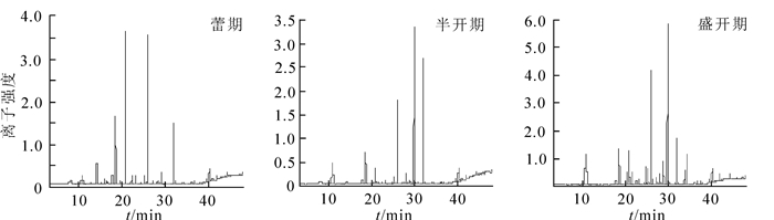 用顶空固相微萃取(HS-SPME)结合气相-质谱联用技术(GC-MS)对蕾期、半开期、盛开期山矾Symplocos sumuntia花的挥发性物质进行鉴定。结果表明:从3个花期的山矾花分别鉴定出35,39,42种挥发物,属于醇类、酮类、酯类、醛类、芳香族类和酸类化合物,各时期最主要的花香物质是醇类和酮类。蕾期相对含量高的物质是芳樟醇(20.19%),双花醇(19.45%),反式-氧化芳樟醇(12.68%);半开期的是β-紫罗兰酮(33.38%),3,4,5-三甲氧基甲苯(15.29%),桉油醇(11.90%);盛开期的是β-紫罗兰酮(19.14%),桉油醇(18.17%),双花醇(13.09%)。因此,山矾花的主要香气成分为β-紫罗兰酮、桉油醇、双花醇、反式-氧化芳樟醇、芳樟醇和3,4,5-三甲氧基甲苯,其中,β-紫罗兰酮对半开期花香贡献最大,而盛开期的香气是由多种物质共同贡献。结果为山矾花香利用及昆虫传粉研究提供了科学依据。图3表1参39