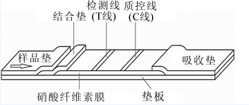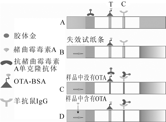 针对霉菌毒素精准检测技术的开发对于保障食品安全至关重要。利用胶体金与赭曲霉毒素A单抗偶联物和赭曲霉毒素A-BSA偶联物(OTA-BSA),开发了一种快速检测赭曲霉毒素A的方法。研究结果表明:①当OTA-BSA配制终质量浓度为4.8 g·L-1,质控线用羊抗鼠IgG配制终质量浓度为1.5 g·L-1,硝酸纤维素(NC)膜的包被量为1.0 μL·cm-1时呈现最清晰、最均匀的条带。②赭曲霉毒素A胶体金快速检测试纸条的灵敏度达到1.0 μg·L-1,检测时间仅为5 min,非常适合现场快速检测。该检测试纸条具有携带方便、灵敏度高、特异性强等优点。由于本方法检测时间短,灵敏度高,与传统的仪器和酶联免疫检测方法相比,在野外和临床检测中更具有推广应用价值。图5表1参12