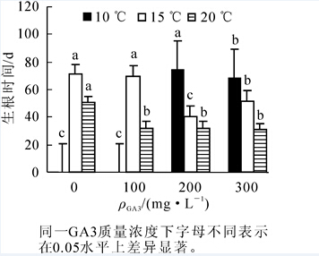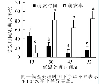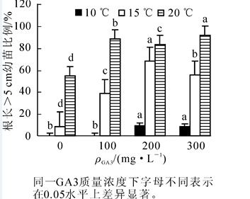 为研究不同处理对凤丹Paeonia ostii种子萌发的影响,采用穴盘育苗的方法,研究不同质量浓度赤霉素(GA3,0,100,200,300 mg·L-1)结合不同温度(10,15,20℃)的处理对凤丹种子生根的影响,不同主根长(根长1~5 cm,根长>5 cm)对生根种子萌发的影响,不同低温处理时间(15,30,45,52 d)对已生根种子萌发的影响以及下胚轴最膨大处直径和侧根数量对根长>5 cm种子萌发的影响。结果表明:20℃结合300 mg·L-1赤霉素(GA3)处理,最有利于凤丹种子生根;对已生根种子4℃低温处理52 d后萌发率最高,达到84%,但耗时过长,且与低温处理30 d的萌发率差异不大,故30 d的低温处理是打破已生根凤丹种子上胚轴休眠的最佳方法;当穴盘透气不良时,根长小于5 cm的种子易腐烂,根长大于5 cm的种子极少有腐烂现象,且根长大于5 cm的种子移入温室60 d时,萌发率达到80%,远高于根长<5 cm的种子萌发率;在同一处理条件下,生根种子下胚轴最膨大处直径大于3.0 mm或侧根数量大于10根时,上胚轴可优先萌发。图4表3参14