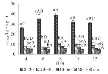 以江西大岗山天然丝栗栲Castanopsis fargesii林下土壤为研究对象,分析土壤有机碳、活性碳和缓效碳质量分数的时空变化特征,为该区域丝栗栲林土壤生态系统固碳现状评价与林业持续管理策略的制定提供理论依据。通过重铬酸钾容量法及室内28 ℃恒温条件下矿化培养和双指数方程拟合方法分别获取不同时期土壤有机碳总量以及土壤活性碳和缓效碳质量分数。土壤有机碳、活性碳和缓效碳质量分数的时空变化采用单因素方差分析方法,数据间的多重比较采用最小显著差(LDS)法。结果表明:土壤有机碳总量以及土壤缓效碳和活性碳质量分数具有相同的剖面特点,0~20 cm表层富集现象明显;和其他时期相比,8月层间质量分数变化最强烈(P < 0.05)。0~100 cm深度范围内,土壤有机碳总量以及活性碳和缓效碳质量分数都表现出4-6月增加、8月最大,其后降低的时间变化特征。4-6月和8-10月0~20 cm土壤缓效碳—活性碳转化强烈,土壤缓效碳质量分数变化显著(P < 0.05),成为影响该阶段土壤有机碳总量显著变化的重要因素。土壤活性碳质量分数没有明显的时间差异变化;4-6月是0~20 cm土壤活性碳质量分数增速最快的阶段,增加速率达1.30 g·kg-1·月-1,但由于受到活性碳—缓效碳强转化和梅雨淋洗的影响,土壤活性碳质量分数没有出现明显增加。土壤有机碳总量和缓效碳质量分数的时空变化特征更为一致。