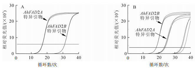 花生Arachis hypogaea油酸脱氢酶AhFAD2是调控花生种子中油酸与亚油酸比值(oleic acid/linoleic acid,O/L)的关键酶,已确定存在2个编码AhFAD2的基因:AhFAD2A和AhFAD2B,但两者在花生中的时空表达特征尚不清楚。选取2个有代表性O/L的花生品种‘山花15’‘Shanhua 15’(O/L为1)和高油酸花生突变体(O/L大于20)为材料,根据AhFAD2A和AhFAD2B基因3'-UTR核苷酸序列的差异,设计了新型、简便的区分两者的特异性引物,并利用实时荧光定量聚合酶链式反应(qRT-PCR)技术,对2个花生品种的7个不同组织(根,茎,叶,花,开花后20,40,60 d种子)中AhFAD2A和AhFAD2B的表达特征进行了分析。结果表明:AhFAD2A和AhFAD2B在‘山花15’和高油酸花生突变体7个组织中都有表达;其中,在2个花生品种3个不同发育时期的种子中,AhFAD2A和AhFAD2B在开花后40 d的种子中表达量最高,推测在开花至花后40 d这一阶段种子中FAD2的表达量可能对花生最终O/L起主要的调控作用。另外,‘山花15’种子中AhFAD2B的表达量显著高于AhFAD2A,而在高油酸花生突变体种子中则相反,推测花生中AhFAD2B在催化油酸去饱和生成亚油酸的过程中比AhFAD2A可能起更重要的调控作用。