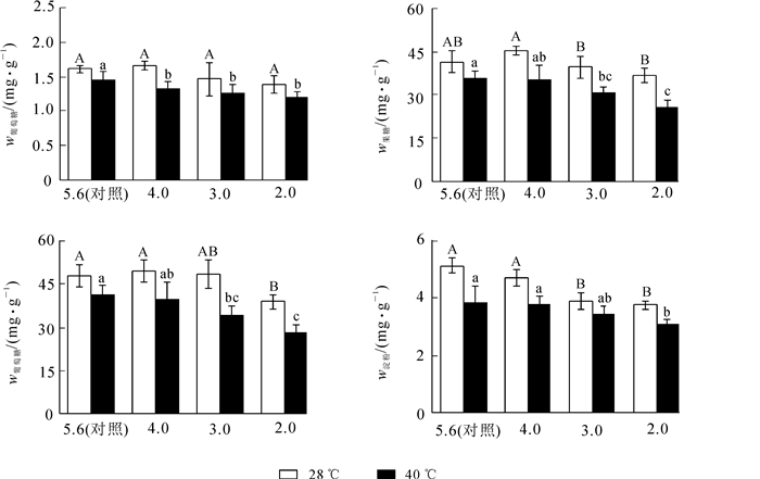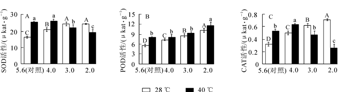 为了揭示桂花品种‘杭州黄’Osmanthus fragrans‘Hangzhou Huang’抵御酸雨高温胁迫的生理生化机制,以‘杭州黄’叶片为材料,采用盆栽人工模拟酸雨胁迫(pH 5.6,pH 4.0,pH 3.0,pH 2.0)和高温胁迫(40℃)进行处理,测定了叶片光合色素,活性氧(ROS),丙二醛(MDA)质量摩尔浓度,抗氧化酶活性和非结构性碳的变化。结果表明:①酸雨或高温单一胁迫后,叶绿素a(Chl a)质量分数、总叶绿素(Chl t)质量分数和Chl a/b均呈降低趋势。酸雨高温协同胁迫后,叶绿素a和总叶绿素质量分数及Chl a/b进一步降低,pH 2.0处理分别比对照降低了27.7%,23.8%和19.5%(P< 0.05)。②ROS和MDA质量摩尔浓度在酸雨或高温胁迫后均显著增加;协同胁迫后,随着pH值的降低,O2·-和MDA质量摩尔浓度显著增加,pH 2.0处理分别比对照增加了158.3%和142.0%(P< 0.05),过氧化氢(H2O2)质量摩尔浓度在pH 3.0时达最大,比对照增加了180.0%(P< 0.05)。③酸雨及高温胁迫后保护酶超氧化物歧化酶(SOD),过氧化物酶(POD)和过氧化氢酶(CAT)活性均显著增加,3种酶共同作用抵御胁迫造成的伤害;协同胁迫后,SOD和CAT活性先升高后下降,而POD仍保持较高活性,pH 2.0处理比对照增加了107.3%(P< 0.05)。④酸雨胁迫后,葡萄糖和果糖质量分数相对稳定,蔗糖和淀粉质量分数显著降低;高温胁迫后,非结构性碳质量分数均显著降低;协同胁迫后,非结构性碳质量分数进一步降低,其中协同pH 2.0胁迫后果糖、蔗糖和淀粉质量分数分别比对照降低了38.1%~41.6%,葡萄糖质量分数比对照降低了22.4%。研究表明:‘杭州黄’在酸雨高温胁迫后通过调节保护酶活性和非结构性碳代谢减轻胁迫造成的伤害,增强机体还原力,表现出较强的抵御酸雨高温胁迫的能力。