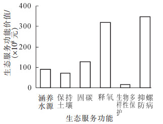 为定量评估长江流域抑螺防病林生态系统的服务功能价值,科学评价林业血防工程生态效益,依据林业行业技术规程LY/T 1721-2008《森林生态系统服务功能评估规范》,选取涵养水源、保持土壤、固碳、释氧、生物多样性保护、抑螺防病6项功能对长江流域抑螺防病林的生态服务功能进行评估。结果显示:2006-2013年长江流域抑螺防病林生态系统服务功能生态效益显著,涵养水源16.16×108t,保持土壤1.46×108t,固碳0.10×108t,释氧0.29×108t,钉螺Oncomelania hupensis面积减少24.35×107m2,血吸虫病患者减少61.31×104人,总价值967.20×108元。其中抑螺防病功能价值最大,占全部生态系统服务功能价值的35.87%,是非抑螺防病林不具备的功能,其次释氧价值占33.06%,固碳价值占13.02%,涵养水源价值占9.17%,保持土壤价值占7.31%,生物多样性保护所占比例最少,仅有1.57%。抑螺防病林生态服务功能价值大小为湖南>湖北>江西>安徽>江苏>四川>云南,其中抑螺防病功能价值最大的为安徽省,达7省抑螺防病功能总价值的18.17%,但其余5项服务价值最大的为湖南省。研究发现,在抑螺防病林的全方位生态系统服务功能中,抑螺防病功能、释氧、固碳、涵养水源、保持土壤等5项生态服务功能价值共占生态系统服务功能价值量的98.43%,是生态服务功能的主体,各种服务功能价值量大小排序为抑螺防病功能价值>释氧功能价值>固碳功能价值>涵养水源功能价值>保持土壤功能价值>生物多样性保护功能价值。其中,湖南省对血吸虫病防治工作的高度重视使抑螺效果发挥作用最大;云南省山丘区,钉螺适生环境多样,而且其生命力强,繁殖快,血吸虫病的预防和控制难度相对较大,抑螺效益不显著。