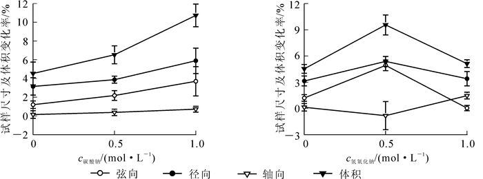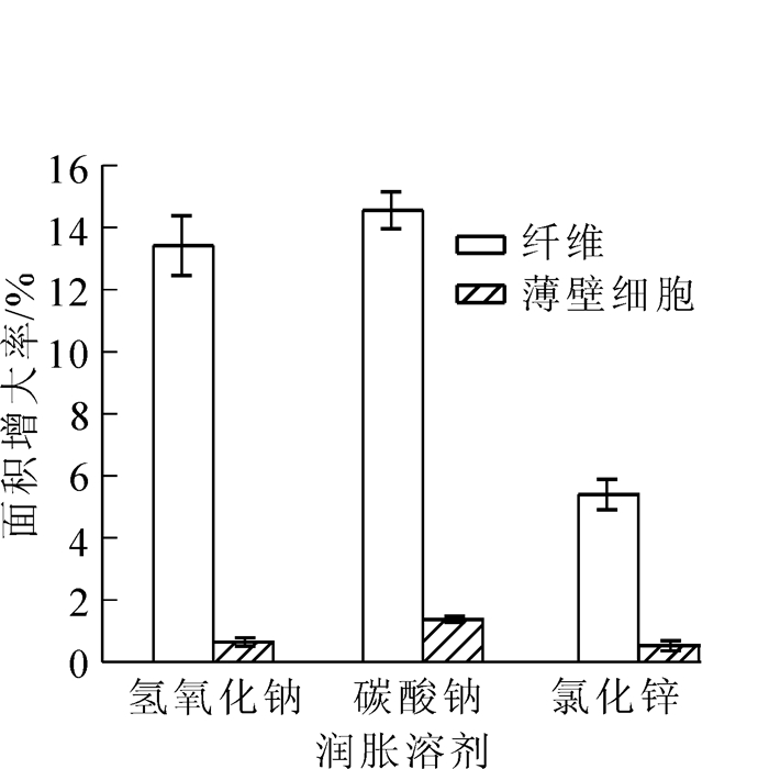 以毛竹Phyllostachys edulis为研究对象,采用不同浓度无水碳酸钠(Na2CO3),氢氧化钠(NaOH),氯化锌(ZnCl2)水溶液(结合硝酸蒸煮)及去离子水对毛竹材进行润胀处理,以体积、面积变化率作为润胀效果的影响指标,观察毛竹宏观、微观构造的变化,探究在不同水溶液中毛竹材的润胀效果。结果表明:氢氧化钠水溶液与碳酸钠水溶液对毛竹的润胀效果较好;润胀效果随水溶液浓度的变化而变化,氢氧化钠水溶液浓度越低,润胀效果越好,而碳酸钠水溶液则相反,其中0.5 mol·L-1氢氧化钠水溶液和1.0 mol·L-1碳酸钠水溶液对毛竹的润胀效果最佳,体积增大率分别为9.69%和10.57%;直接使用氯化锌水溶液对毛竹进行润胀,润胀效果较差,但低浓度硝酸水溶液预处理可提高氯化锌水溶液对毛竹的润胀效果,其中500 g·L-1氯化锌水溶液浸泡后(100 g·L-1硝酸水溶液预处理)体积增大率为7.98%。同时,通过对润胀前后毛竹横切面不同区域面积的计算,显示在润胀过程中,纤维鞘区域面积变化幅度明显大于薄壁细胞区域面积变化幅度,说明毛竹润胀后体积变化的因素主要来源于纤维鞘分布面积的变化。