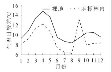 2012年1-12月,通过定位监测麻栎Quercus acutissima林林内外温湿度,探究林分对空气温湿度的调节作用。选取45 a树龄的麻栎林为研究对象,以裸地作为对照组,在麻栎林、裸地样地中选择光照条件、土壤状况一致的试验点,使用Decagon自动气象站收集温湿度数据,分析并建立回归方程,并分季节、时间段进行均值检验。研究表明:①林内外温度日变化曲线为抛物线型,相对湿度日变化曲线为U型,林内外温湿度日变化呈对称关系。②麻栎林处在生长旺季时,林内温湿度变化幅度小于林外,5-8月麻栎林降温作用最显著,8月麻栎林增湿作用最显著。③从全年来看,麻栎林全年降温13 661.4℃,季节温度林内外差值夏季>春季>冬季>秋季。较裸地全年相对湿度增加41 769.69%,季节相对湿度林内外差值夏季>秋季>春季>冬季。对比夏季不同时段温湿度相关性,14:00温湿度变化相关性显著,全年气温林内(y)和林外(x)的线性回归方程为y=0.886 6x+1.207 6,R2=0.972 3。全年相对湿度林内(y)和林外(x)的线性回归方程为y=0.961 8x+0.042 3,R2=0.978 0。结合全年观测数据进行均值检验,全年林内外温湿度变化不显著,夏季林内外相对湿度变化显著,对比夏季不同时段温湿度相关性,在中午时分麻栎林降温增湿作用较显著。