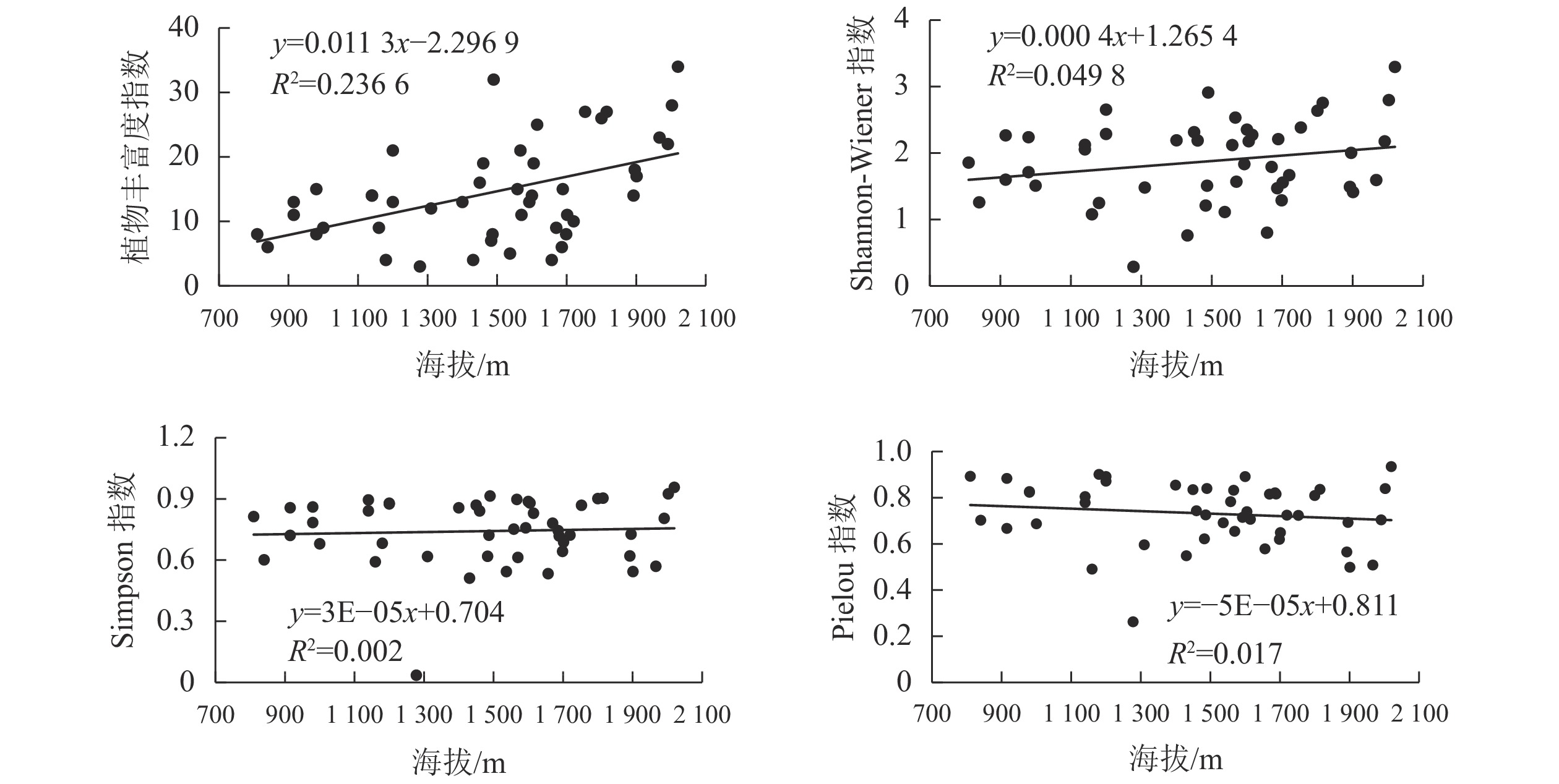 P<0.05)。③ 在海拔800~1 400 m,上段、中段和下段多样性差异不显著,而在海拔1 400~2 000 m,多样性从大到小依次为下段、中段、上段;同一坡向下段的植物多样性均高于中段和上段,且下段的Shannon-Wiener多样性指数和Simpson多样性指数显著高于上段(