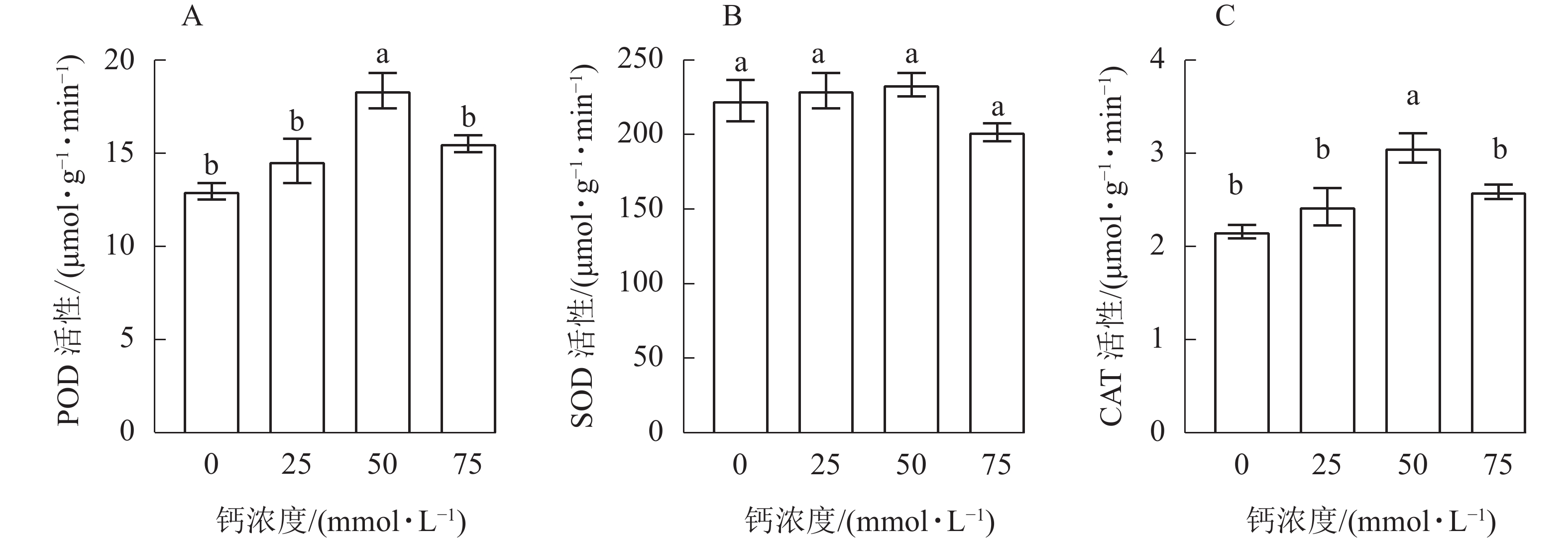 结果不同钙浓度处理对白枪杆幼苗的叶片形态结构、叶绿素质量分数和酶活性有不同的影响。不同钙浓度处理间,白枪杆幼苗的叶片形态结构除比叶长和比叶面积随钙浓度的增加而增加外,其余相关指标均呈先上升后下降的趋势,且叶片数、叶生物量、比叶长、比叶面积、叶绿素质量分数、过氧化氢酶活性、过氧化物酶活性与对照差异显著(