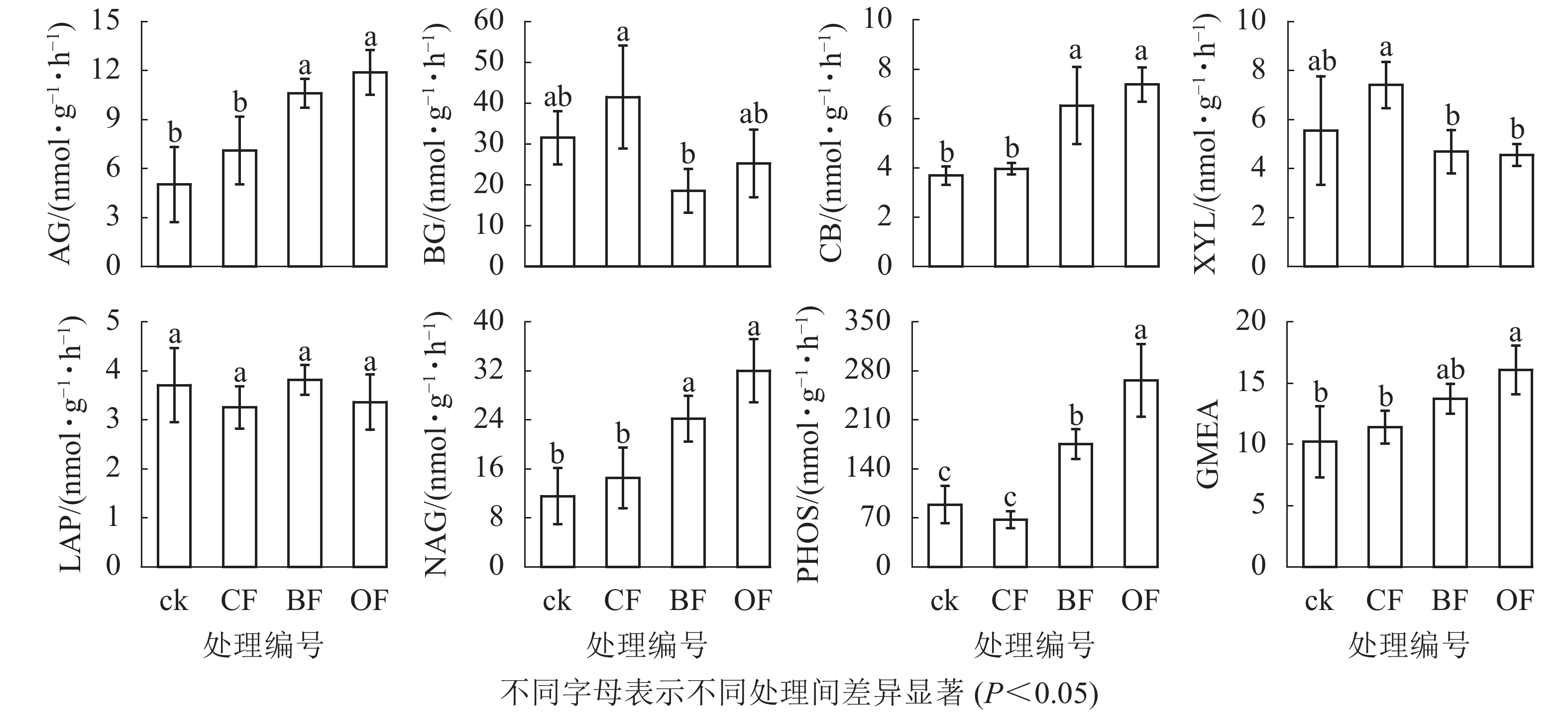 结果与CF处理相比,BF和OF处理对土壤pH、总碳、易氧化态碳、全氮、有效磷、速效钾、硝态氮质量分数无显著影响,而OF处理显著提高了土壤铵态氮和溶解性有机氮质量分数。与ck相比,OF处理显著提高了土壤微生物生物量碳质量分数(164%)、细菌16S rRNA (35%)和真菌18S rRNA基因拷贝数(98%)及真菌/细菌比(50%),而BF处理对上述指标无影响。3种施肥处理对β-葡萄糖苷酶、木聚糖苷酶、亮氨酸氨基肽酶活性均无影响,而BF和OF处理显著提高了土壤α-葡萄糖苷酶(111%和136%)、纤维二糖苷酶(77%和100%)、β-N-乙酰氨基葡萄糖苷酶(109%和177%)和酸性磷酸酶(97%和199%)活性,OF处理平均提高幅度高于BF处理。冗余分析表明:土壤铵态氮、溶解性有机碳和氮、真菌丰度是影响土壤酶活性变化的主要驱动因子。